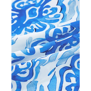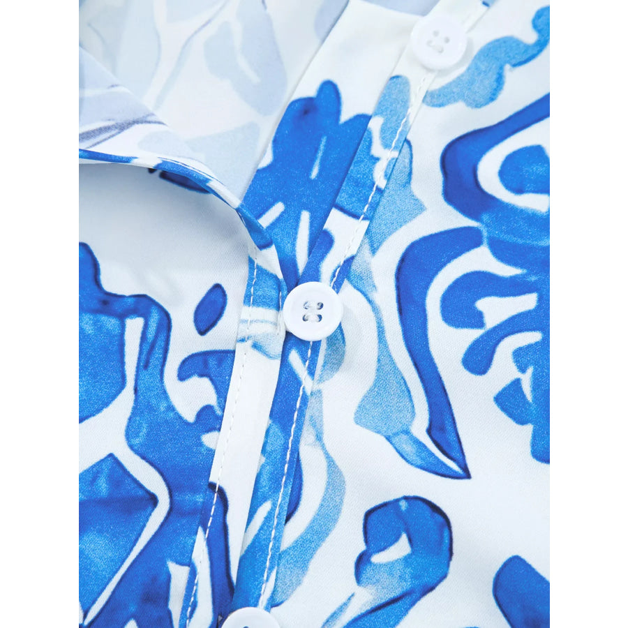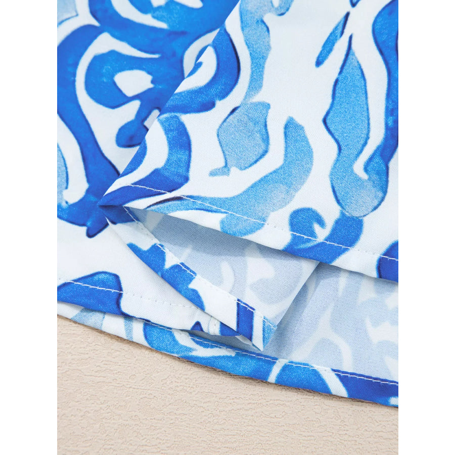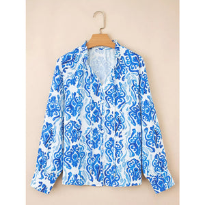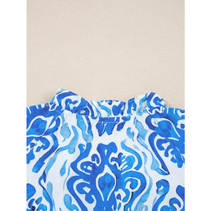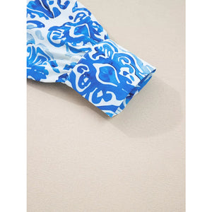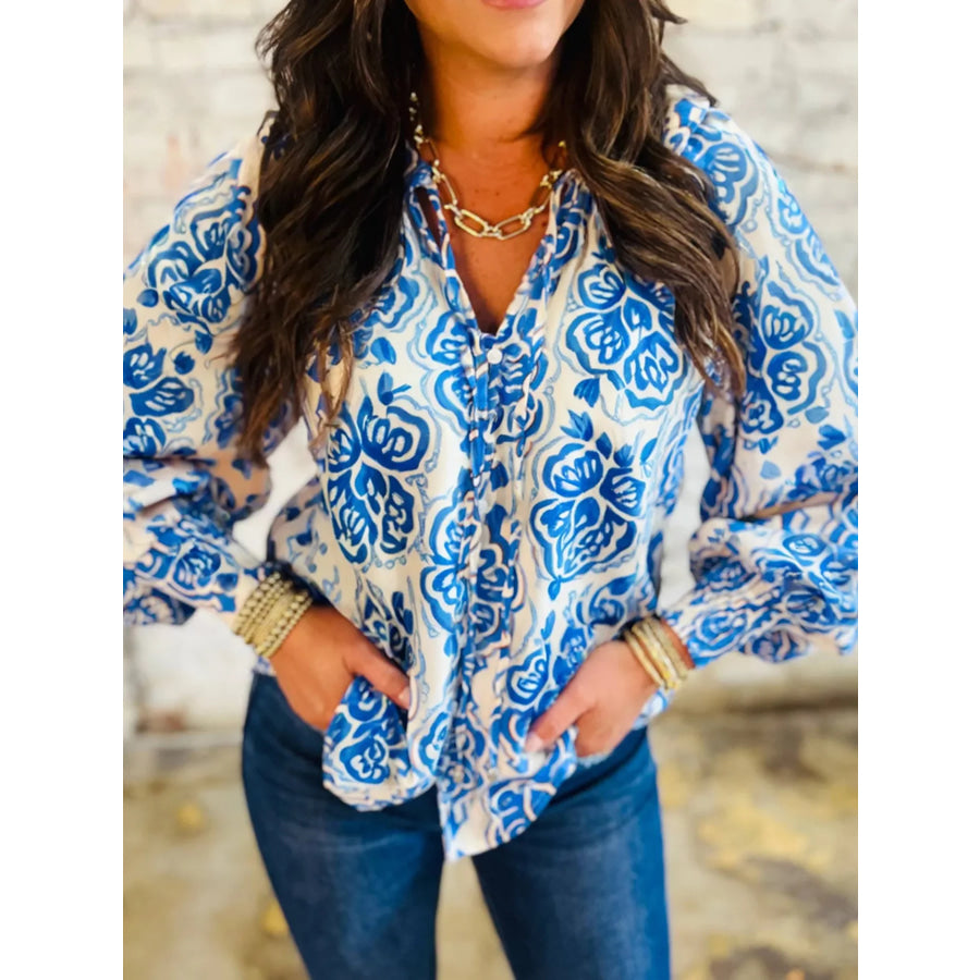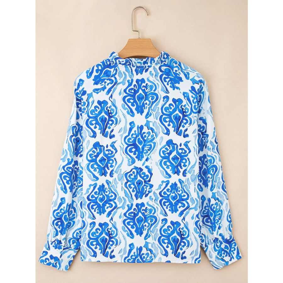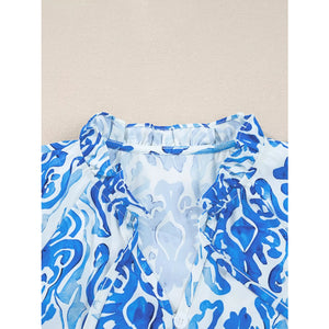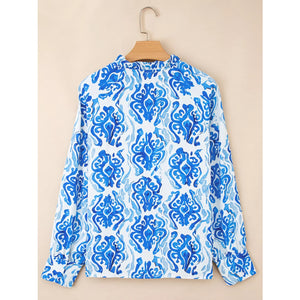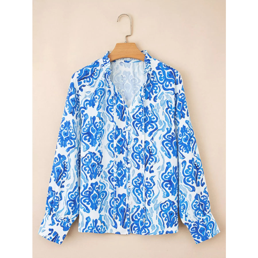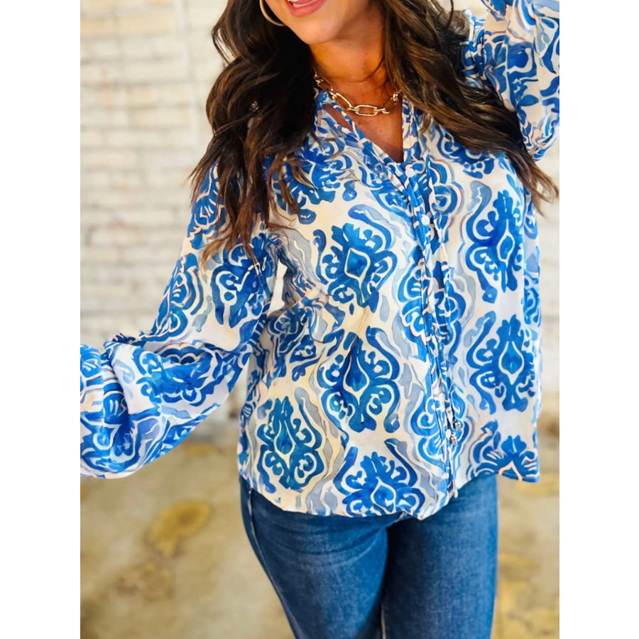 Printed Tie Split Neck Button Front Puff Sleeve Shirt