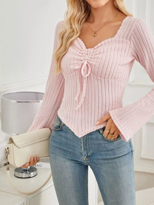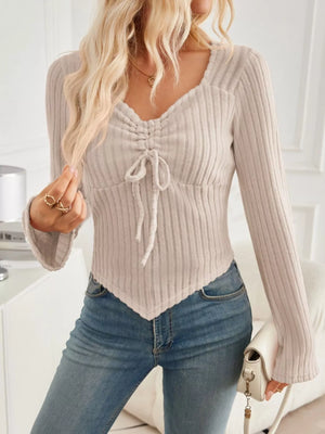 Ribbed Knit Drawstring Long Sleeve T-Shirt