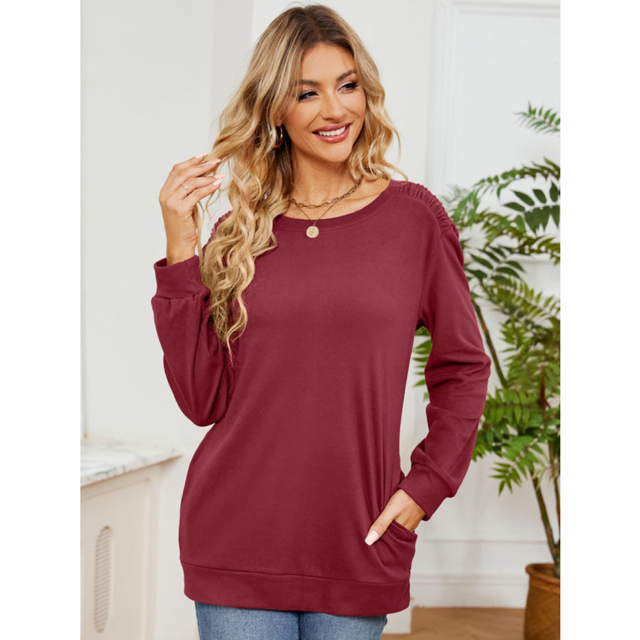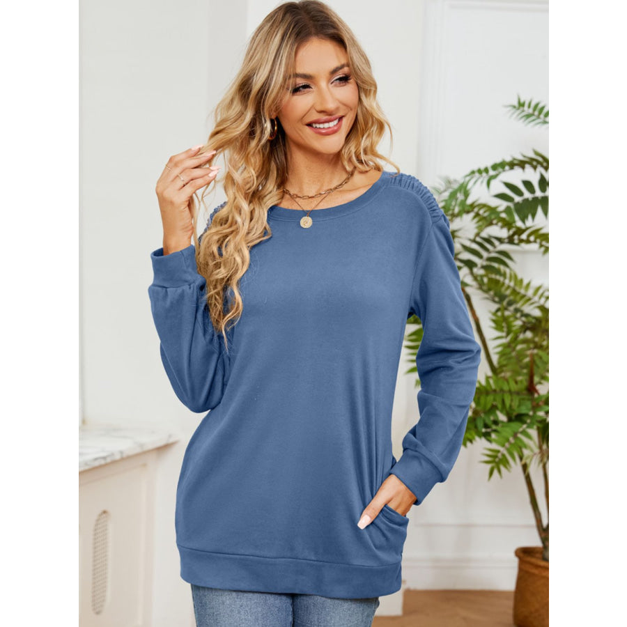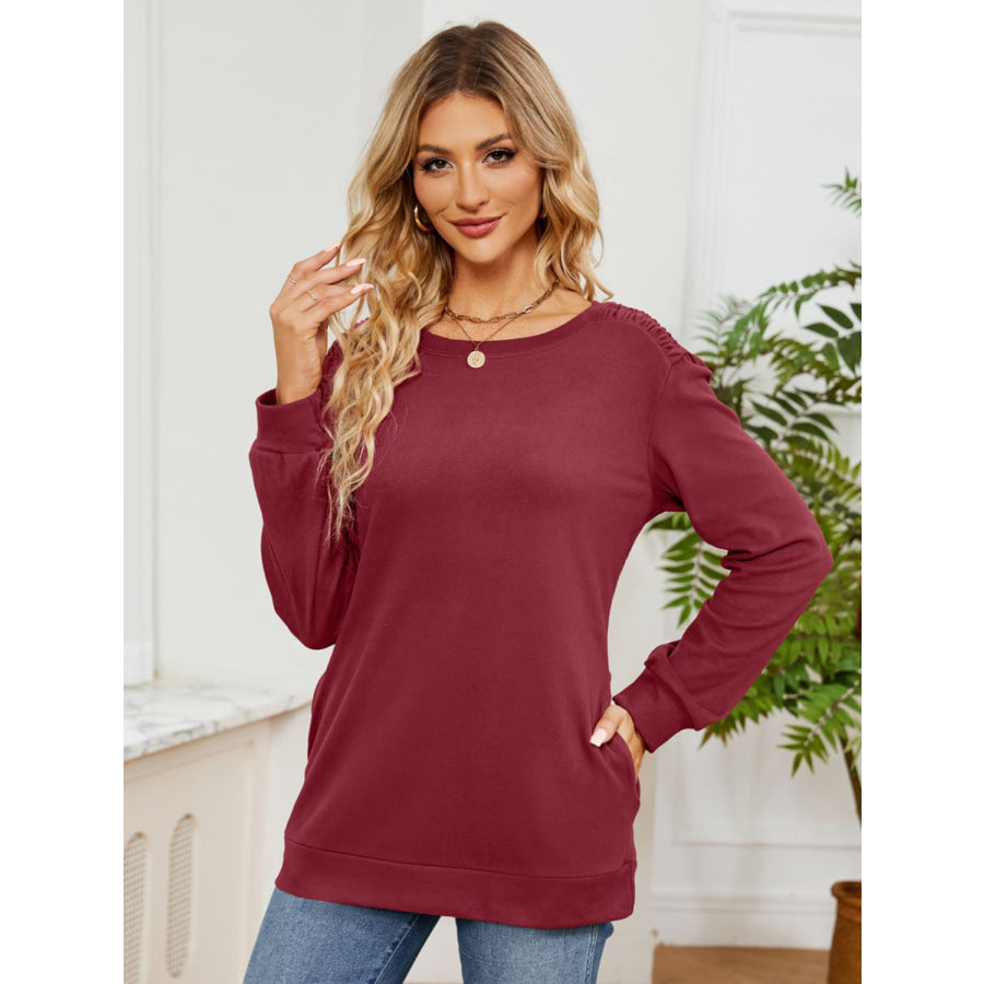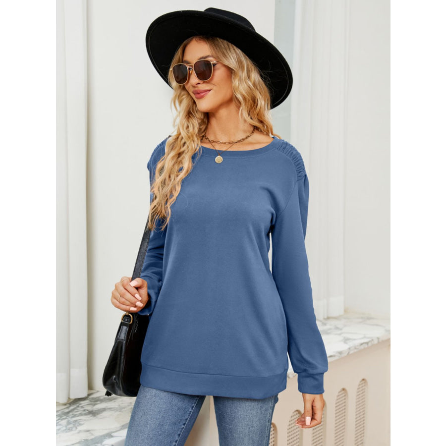 Ruched Shoulder Round Neck Long Sleeve Sweatshirt