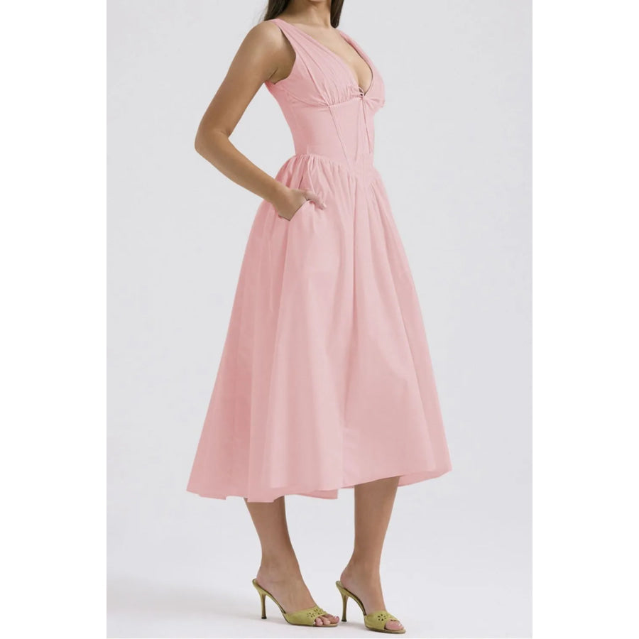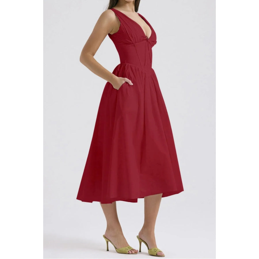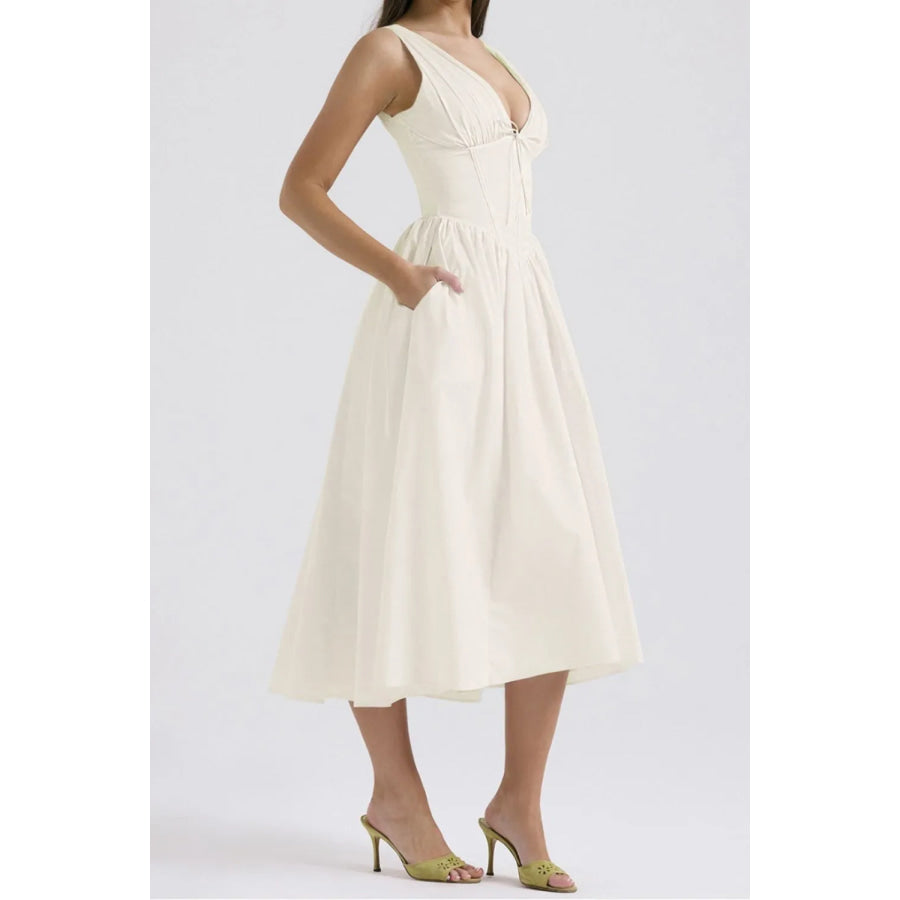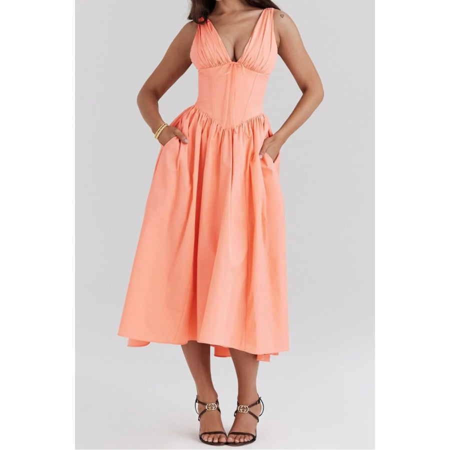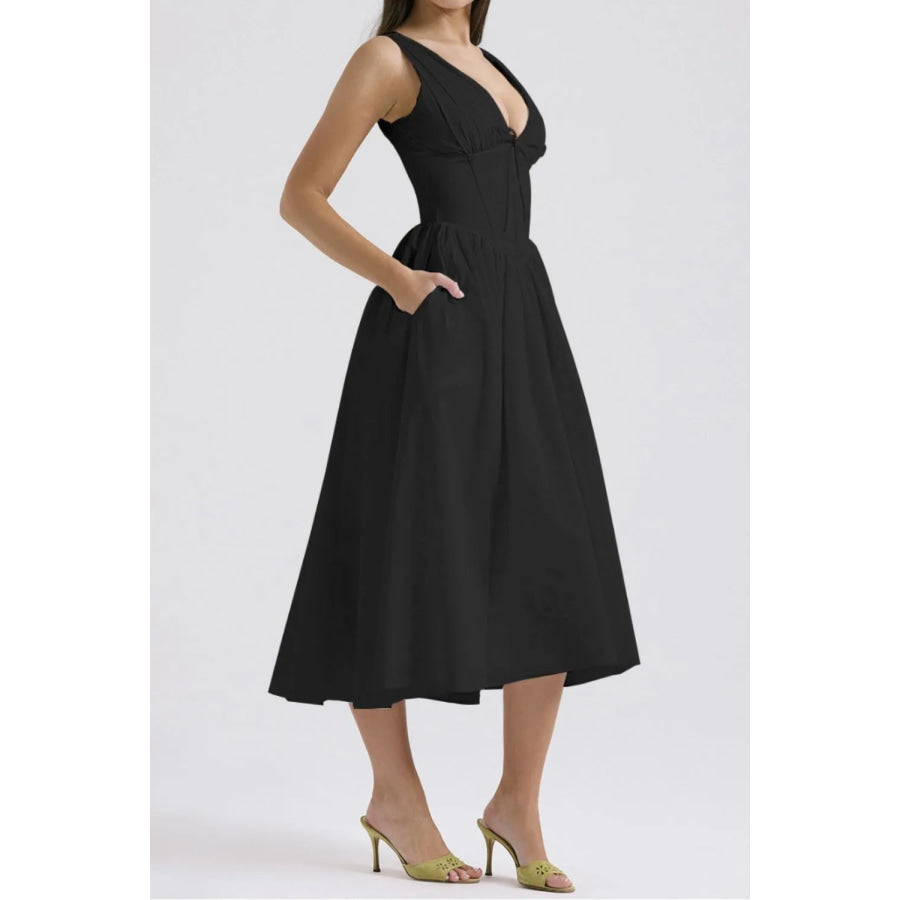 Ruched V-Neck Sleeveless Dress with Pockets