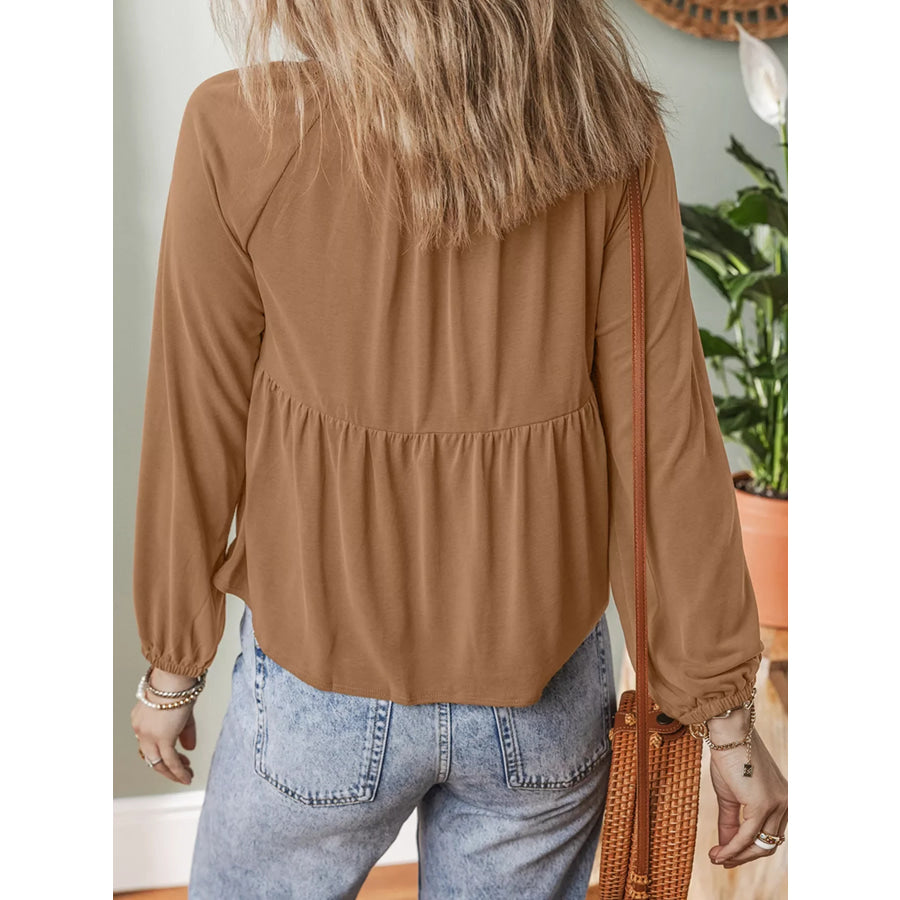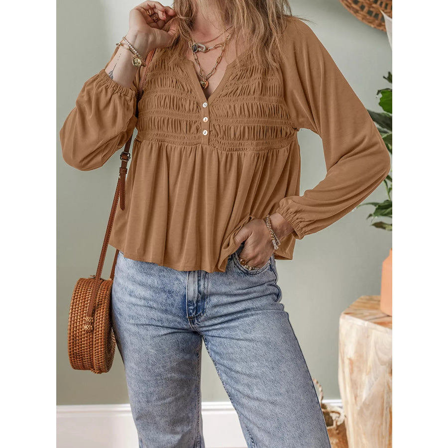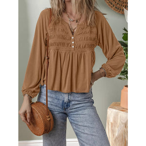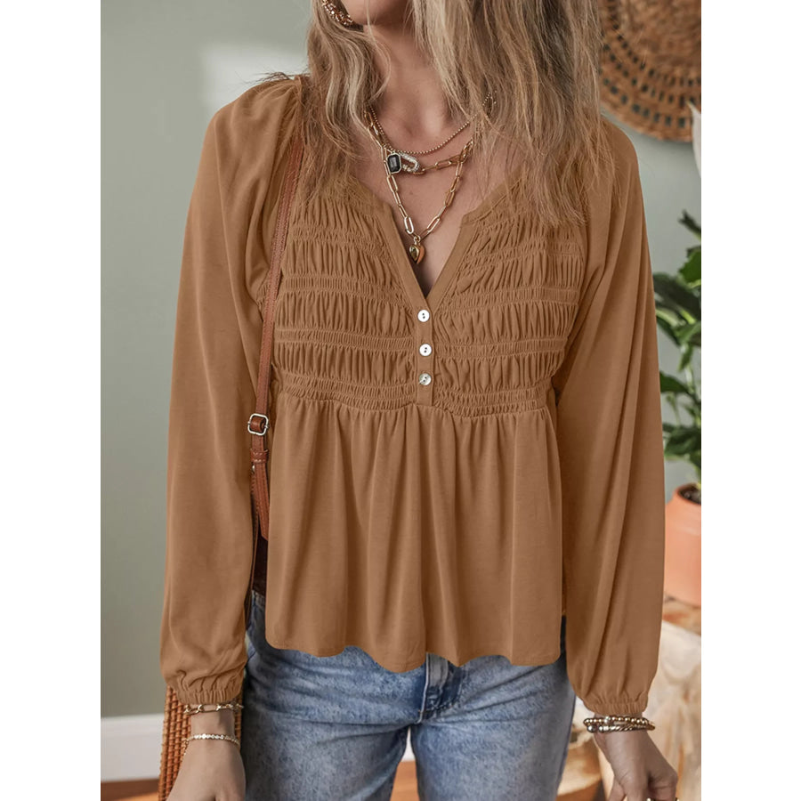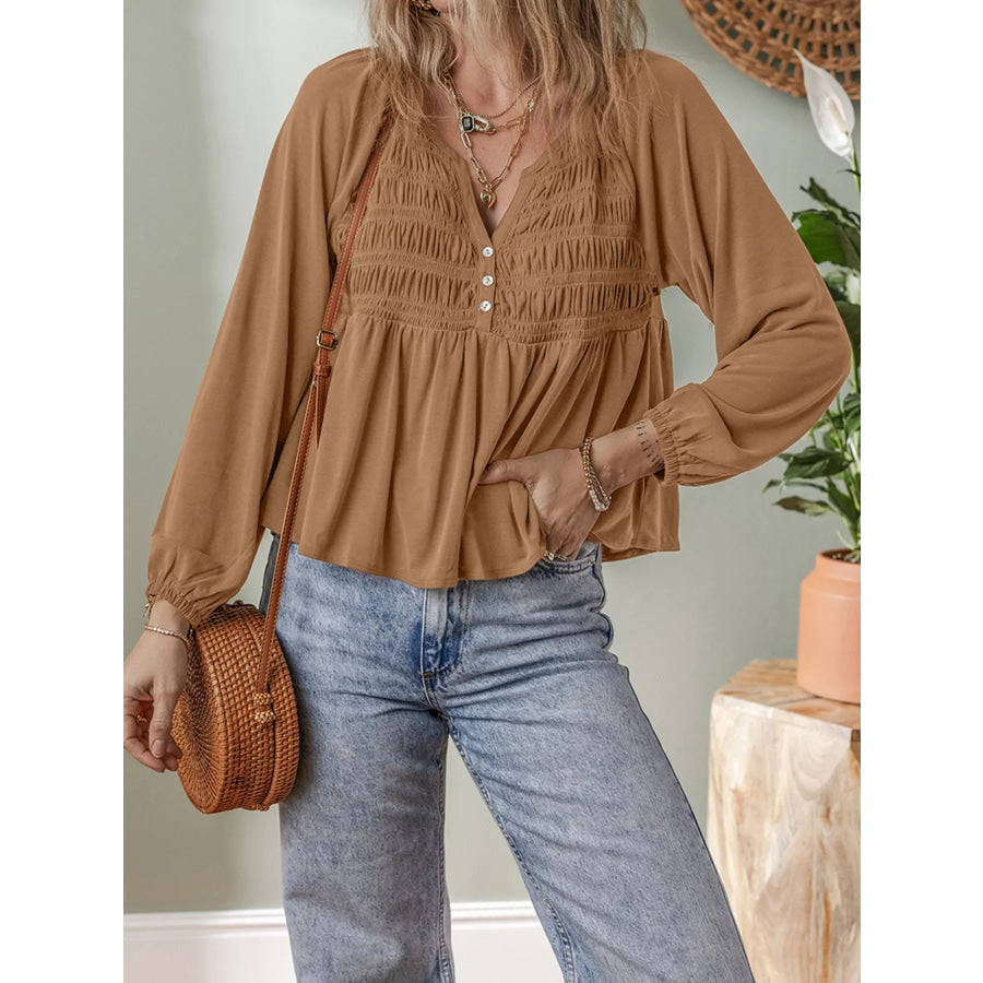 Smocked Buttoned Split V Neck Flow Fit Blouse
