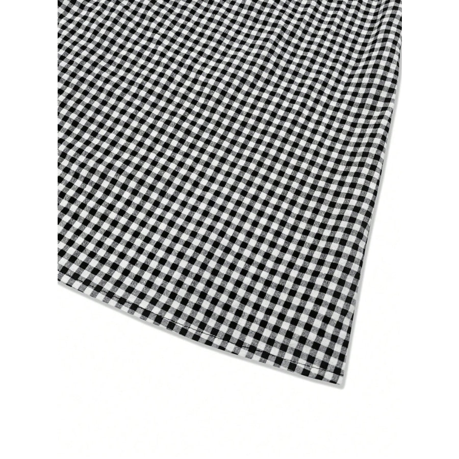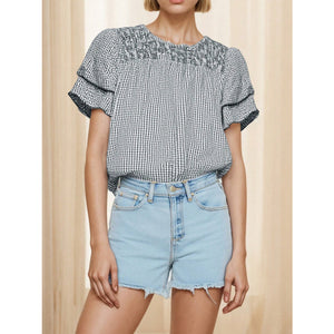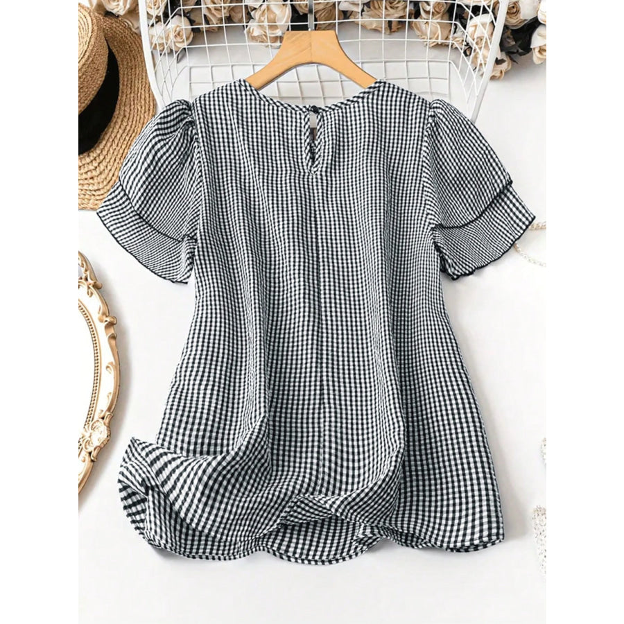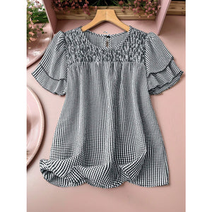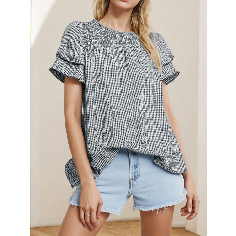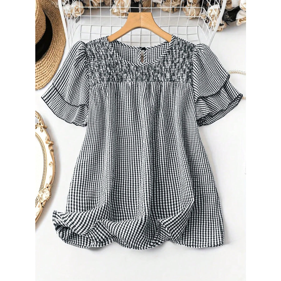 Smocked Plaid Round Neck Layered Short Sleeve Blouse