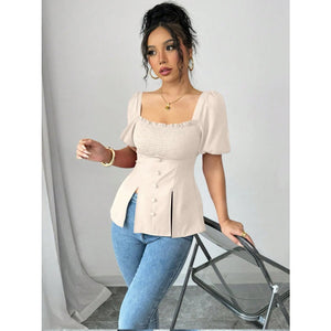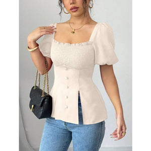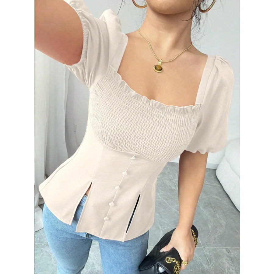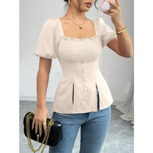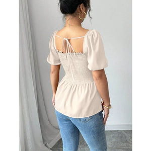 • Features: Smocked, Tied, Decorative Button, Slit, Frill