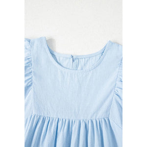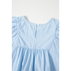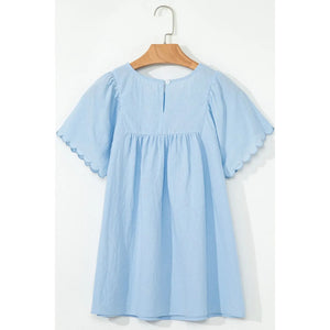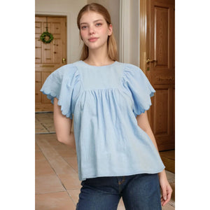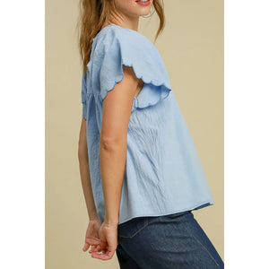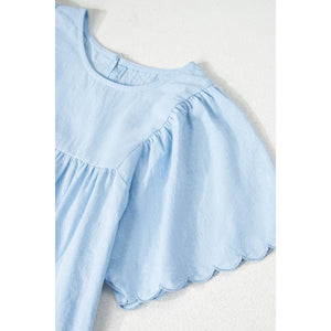 Solid Color Embroidered Scalloped Sleeves Crew Neck Blouse