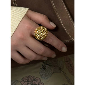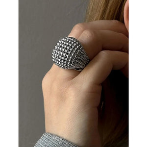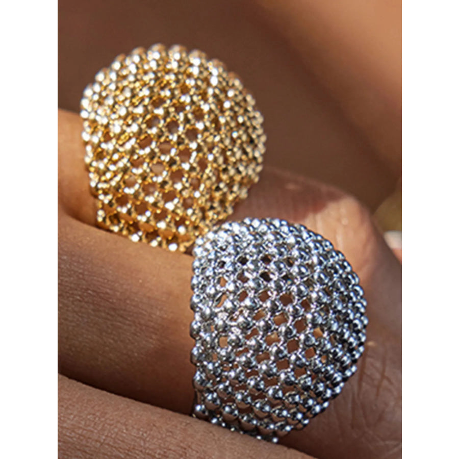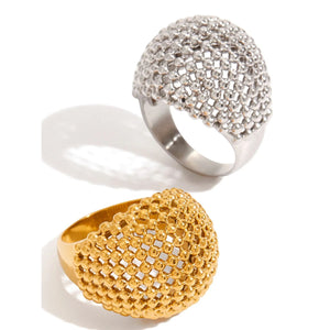 This stunning stainless steel textured dome ring features a distinctive raised dome design with intricate textured surface detailing. Crafted from high-quality stainless steel, this ring offers exceptional durability and tarnish resistance while maintaining its lustrous finish. The bold dome shape creates a striking statement piece perfect for modern fashion-forward women. The comfortable wide band ensures all-day wearability, while the hypoallergenic stainless steel construction makes it suitable for sensitive skin. This versatile ring seamlessly transitions from casual to formal occasions, adding contemporary sophistication to any jewelry collection.
