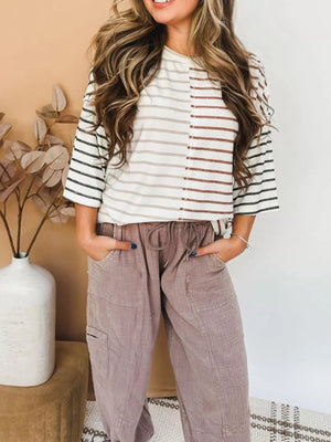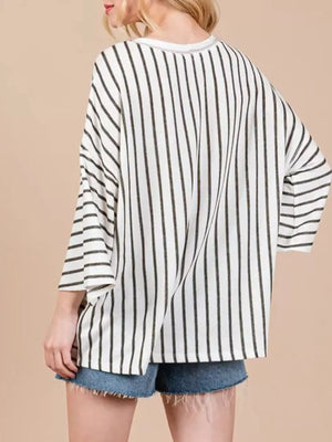 Stripe Color Block 3/4 Sleeve Loose T Shirt