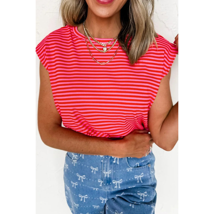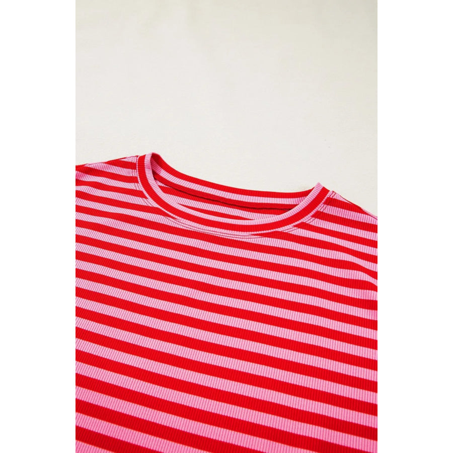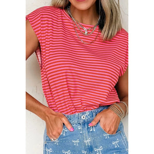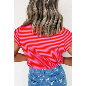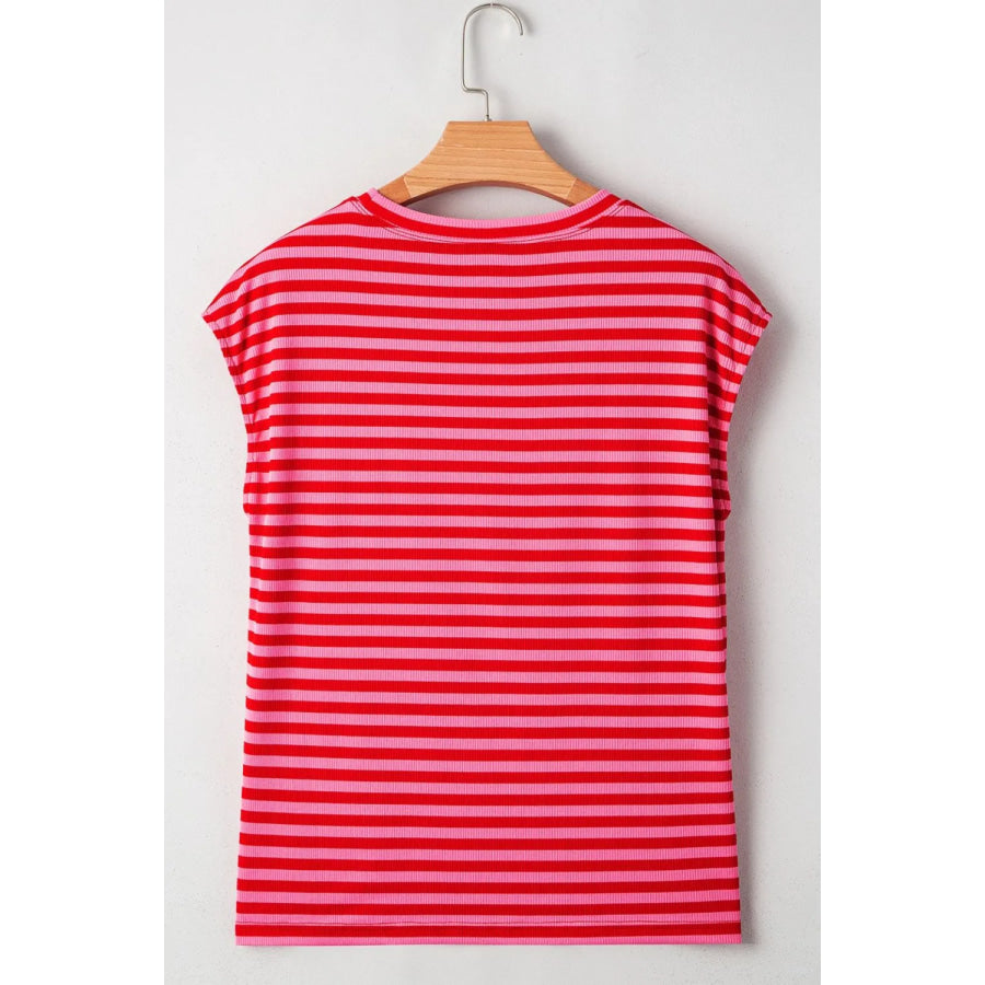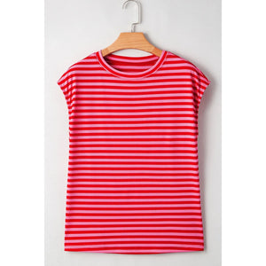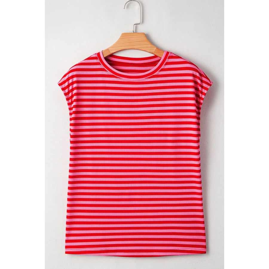 Stripe Ribbed Cap Sleeve Round Neck T Shirt