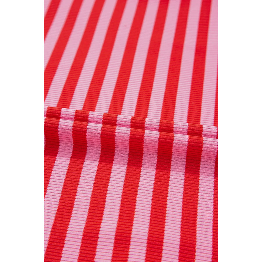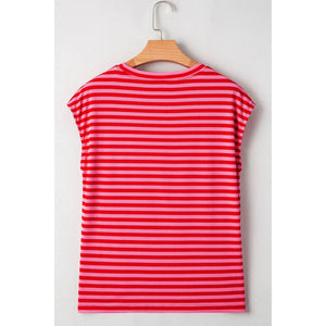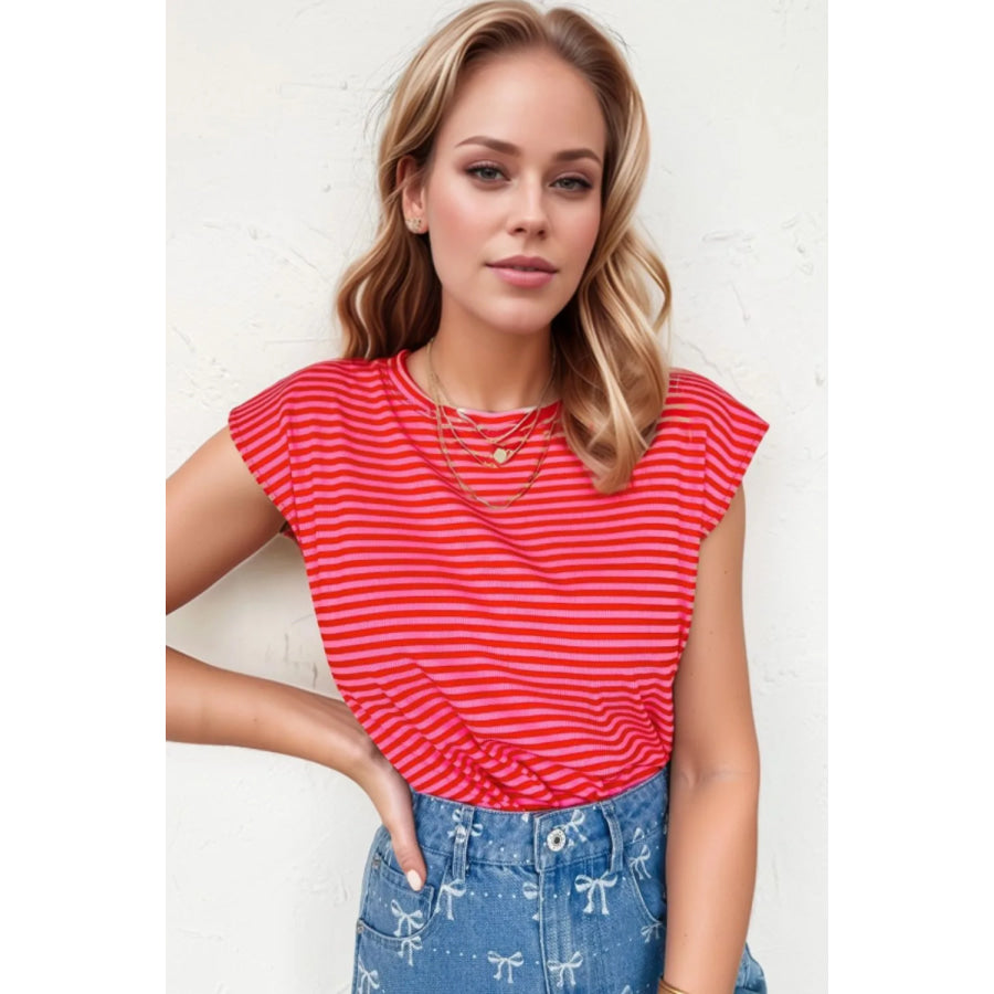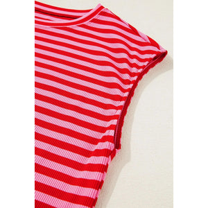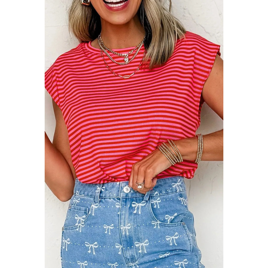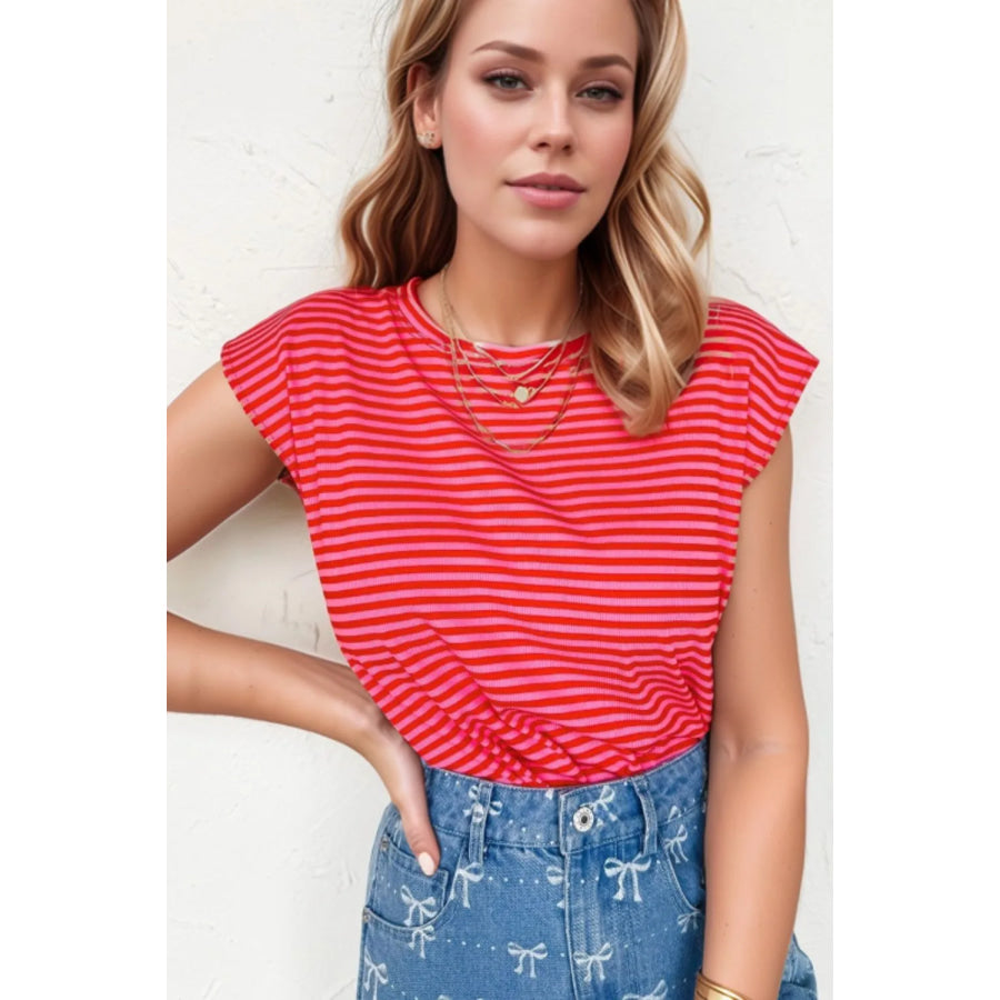 Stripe Ribbed Cap Sleeve Round Neck T Shirt
