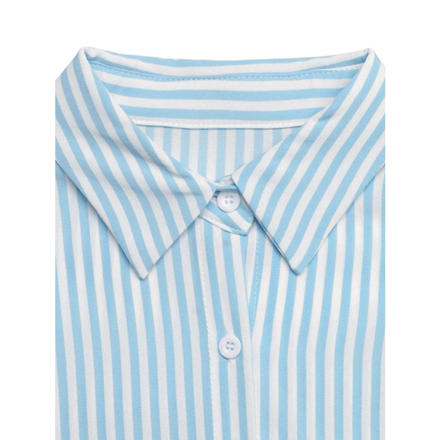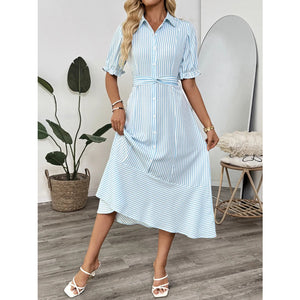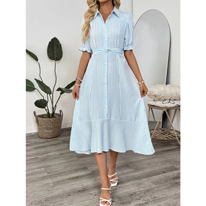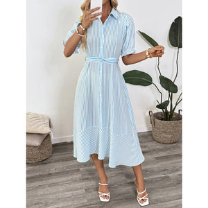 Striped Button-Down Midi Shirt Dress with Ruffle Sleeves