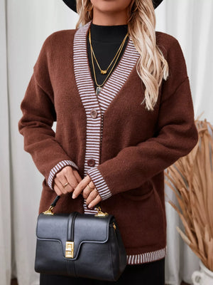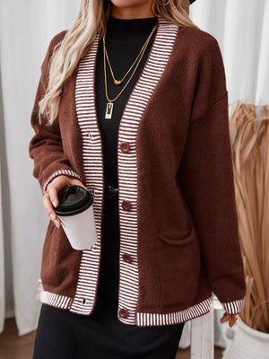 Striped Trim Button Front Pocket Knit Cardigan