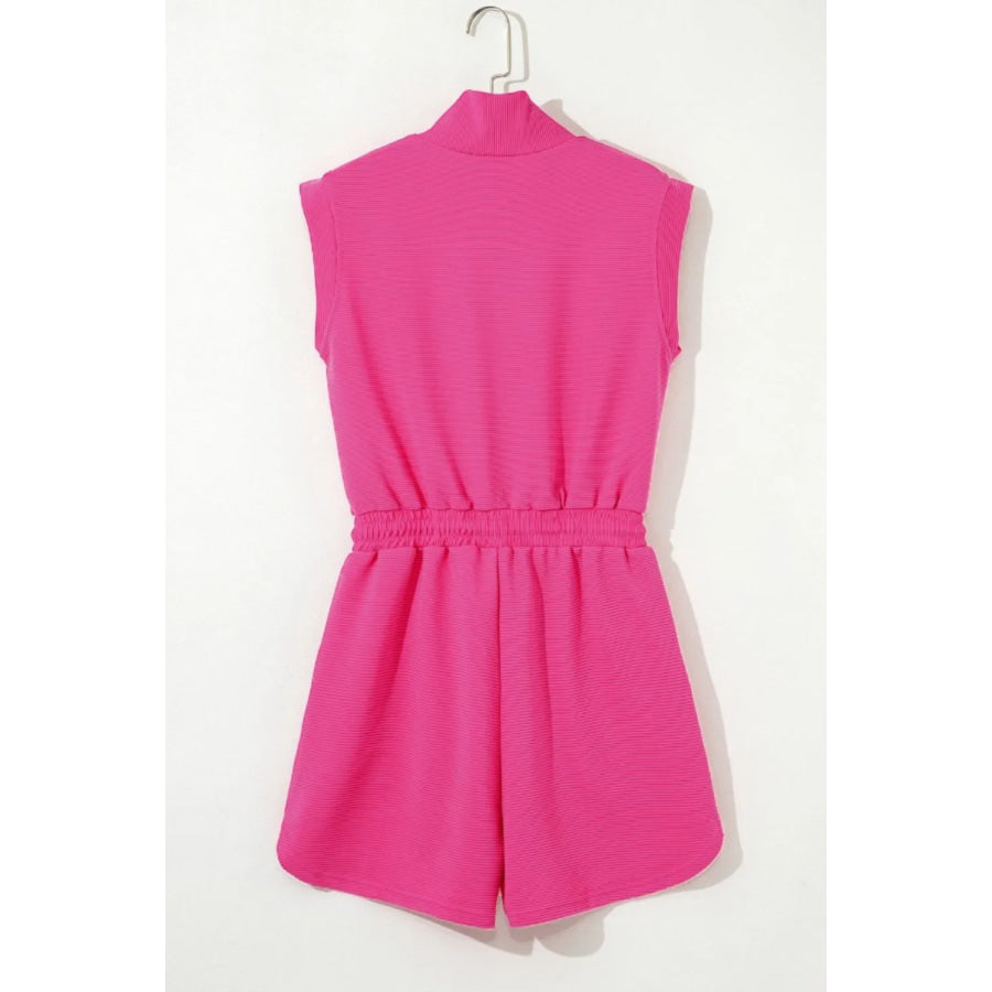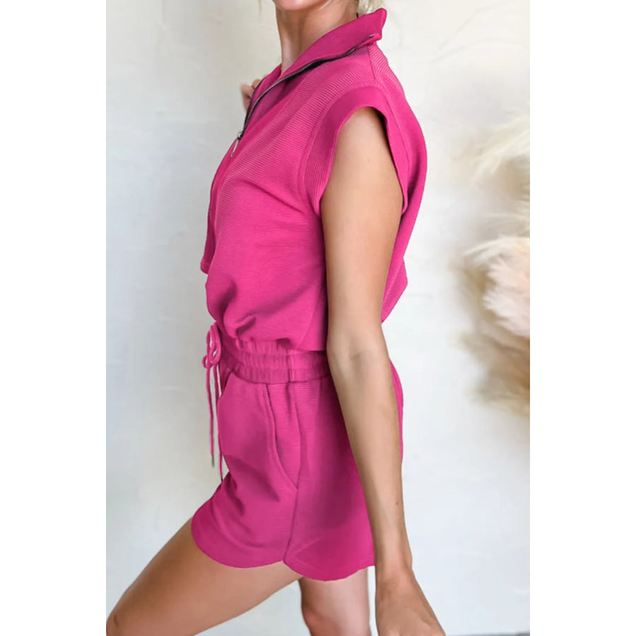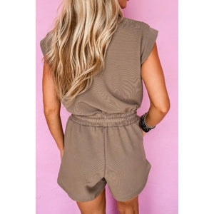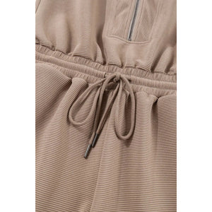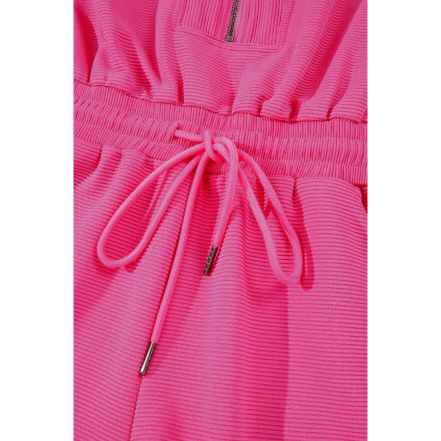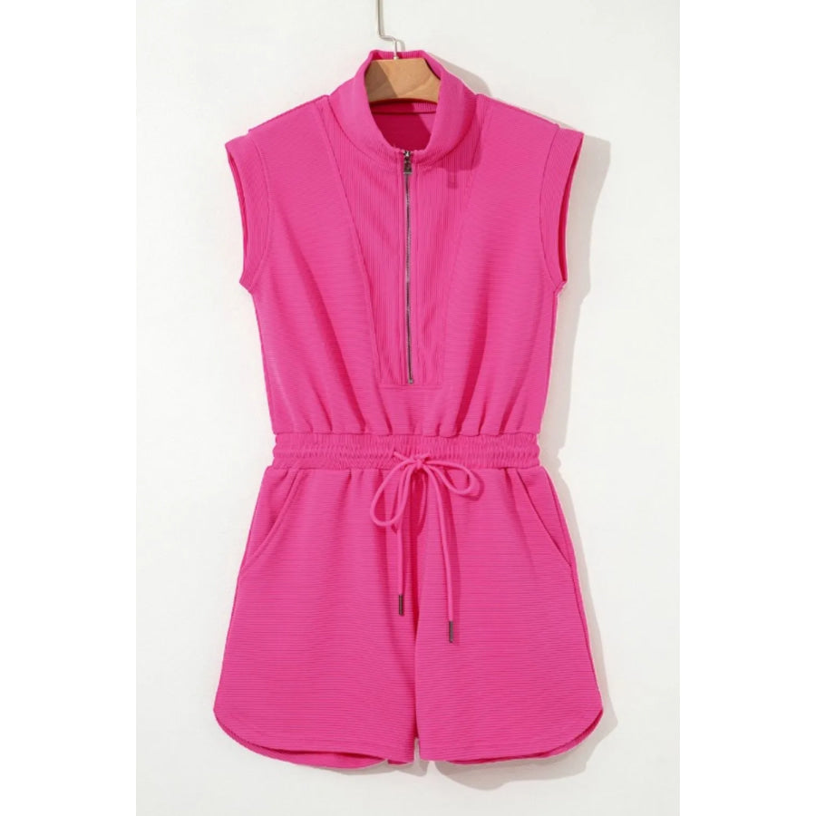 Textured Short Sleeve Half Zip Drawstring Waist Romper