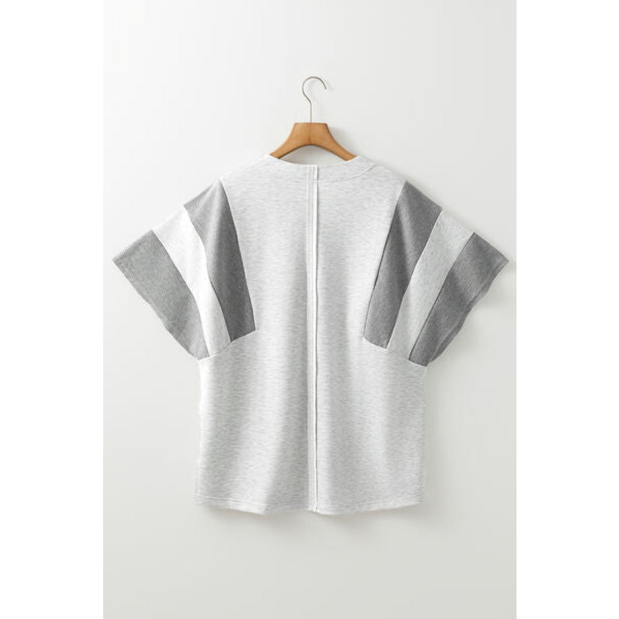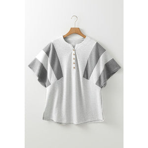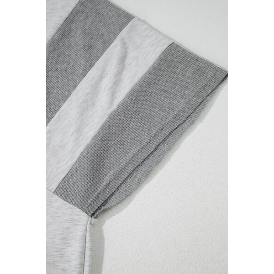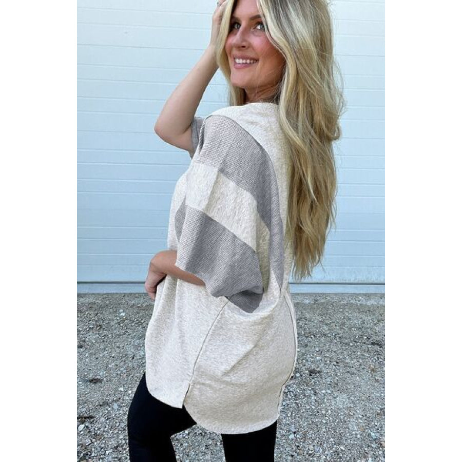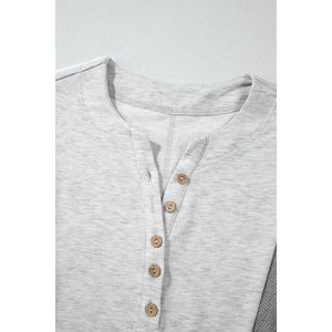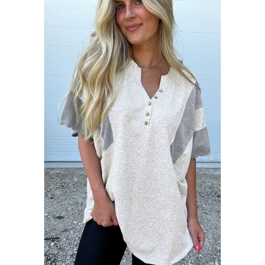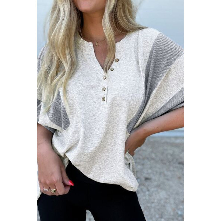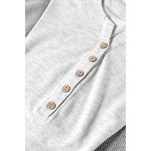 Two Tone Contrast Waffle Knit Patched Buttoned V Neck Top