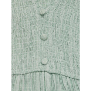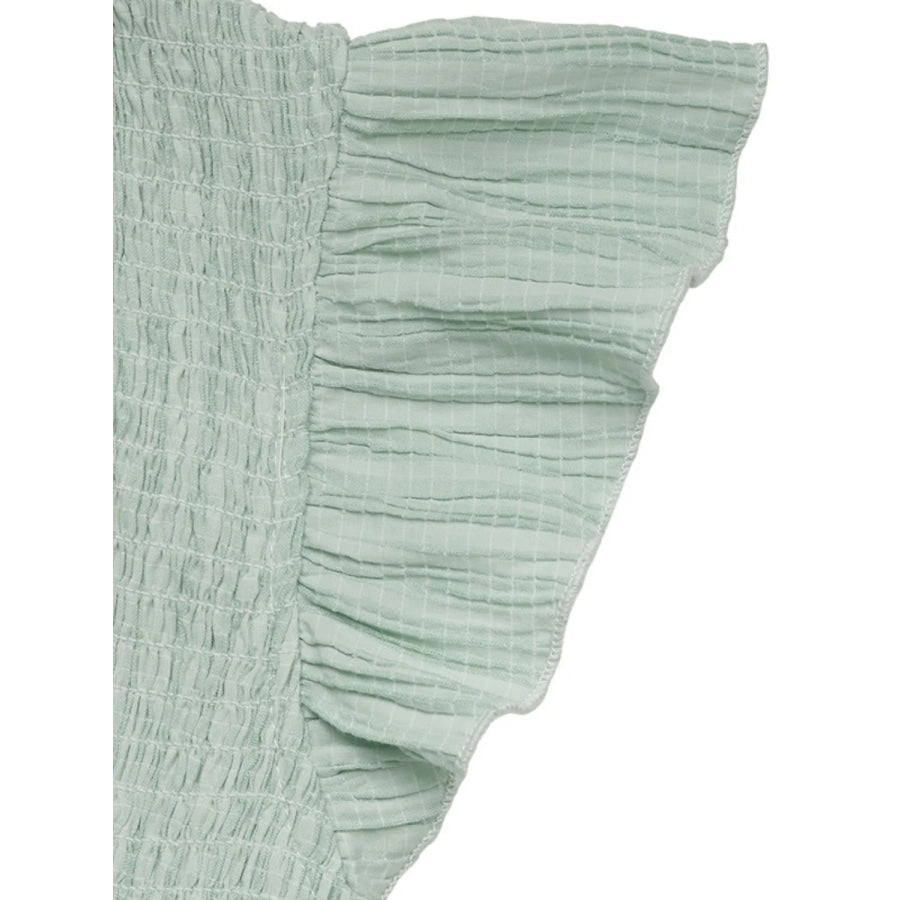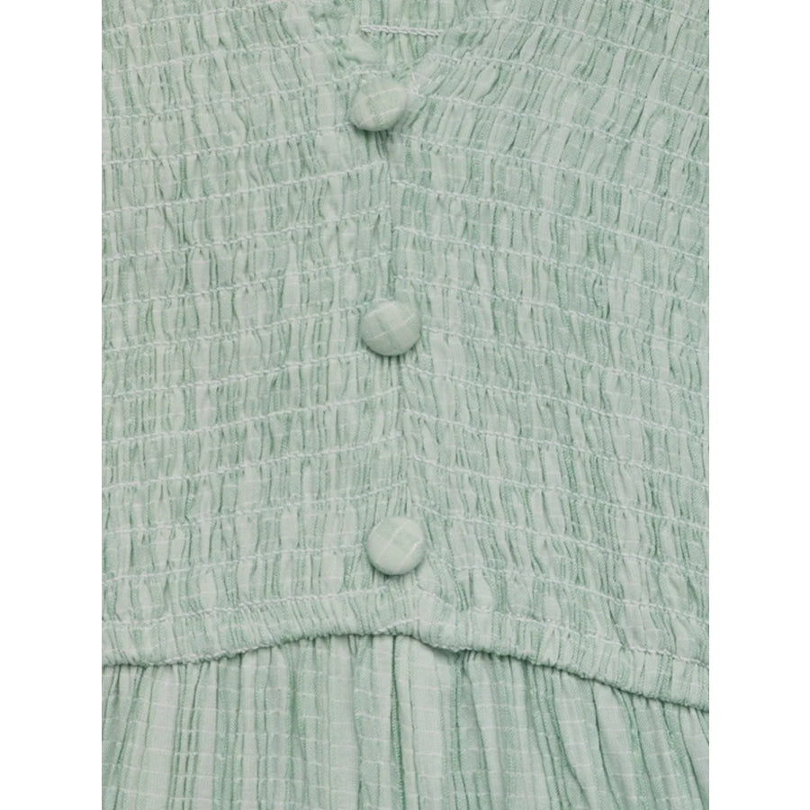 • Features: Ruffled, Decorative Button, Slit, Smocked