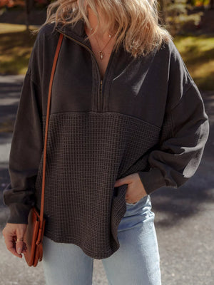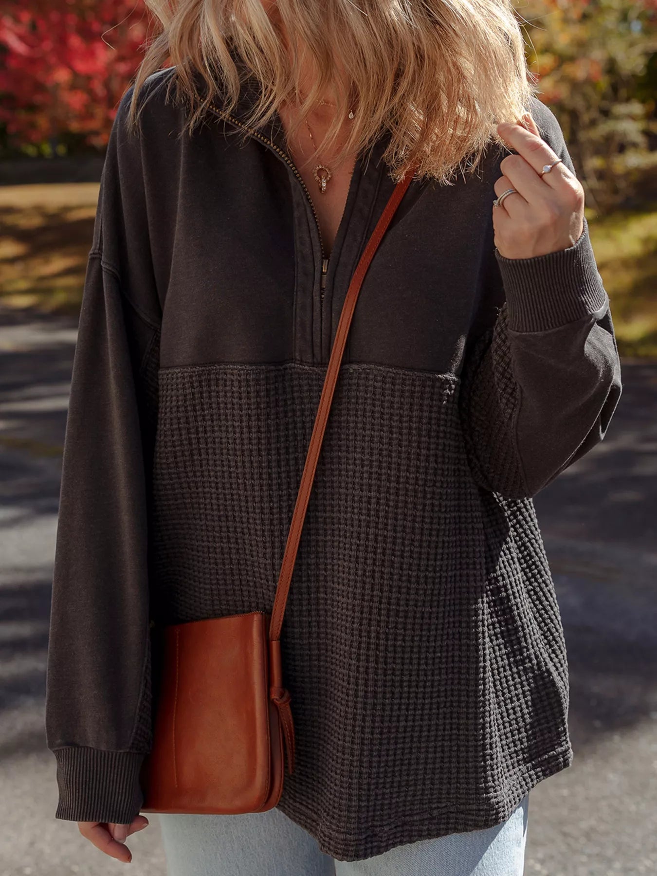 Waffle Knit Patchwork Half Zipped Casual Sweatshirt
