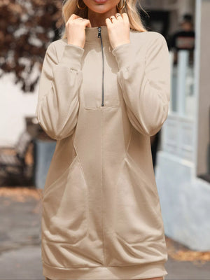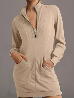 Zip Up Collared Ribbed Patchwork Sweatshirt Dress with Pockets