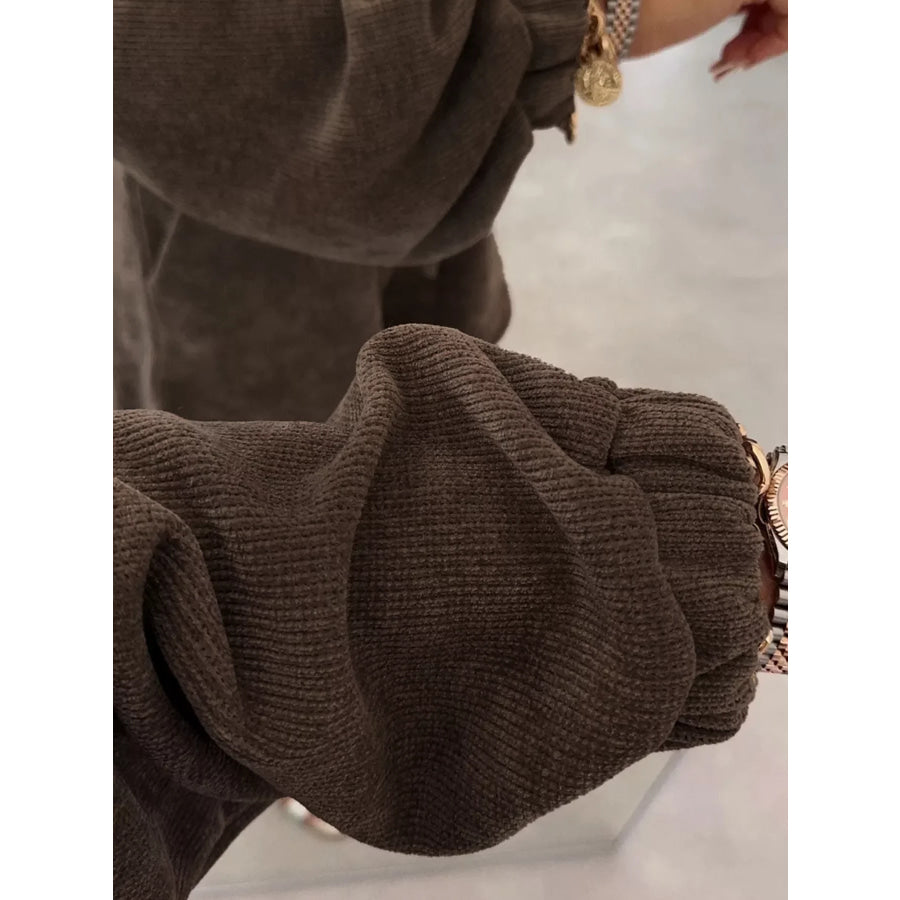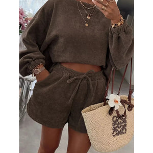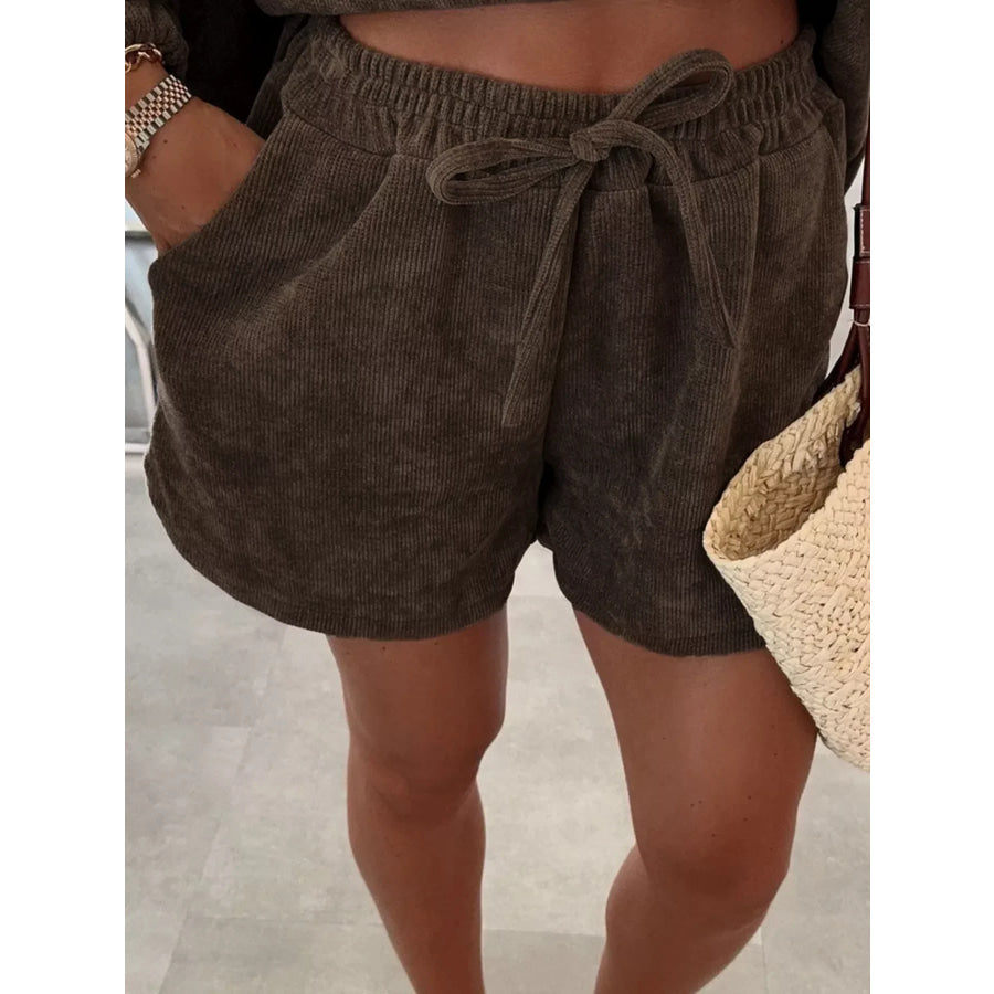 Casual Corduroy Long Sleeve Top and Drawstring Shorts Set