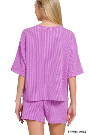 Zenana Raised Rib Short Sleeve Tee and Drawstring Shorts Set