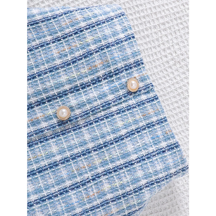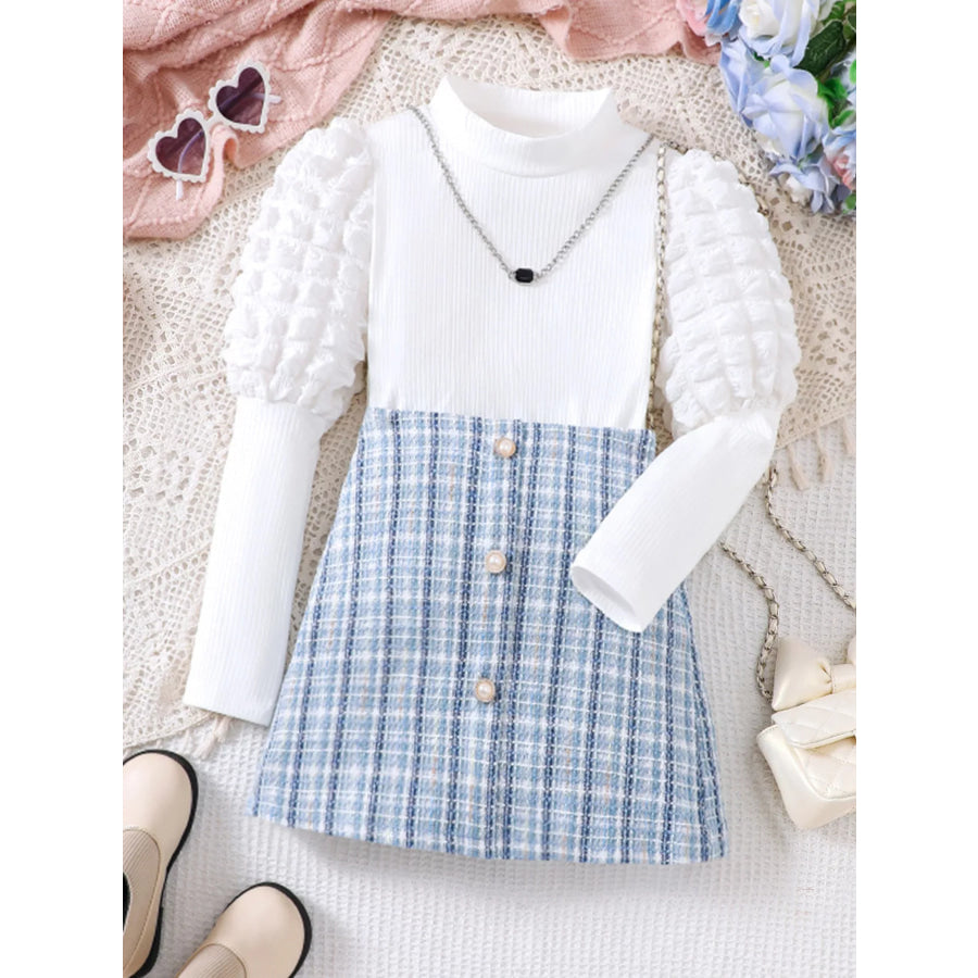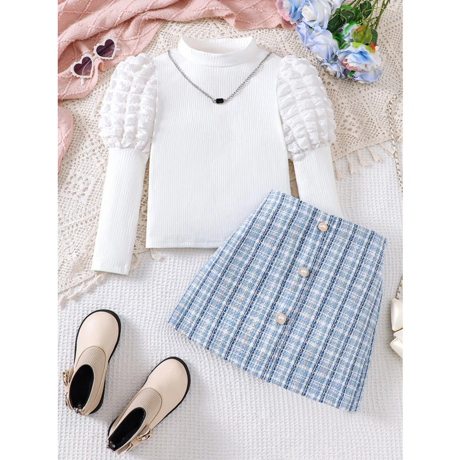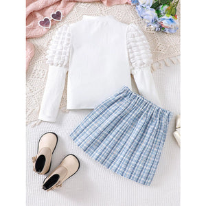 Children's Puff Sleeves Top and Plaid Skirt Set