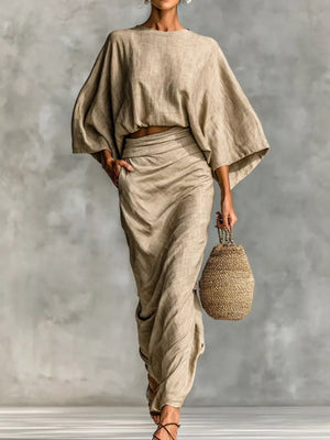Full Size Kimono Sleeve Top and Ruched Skirt Set Plus Size