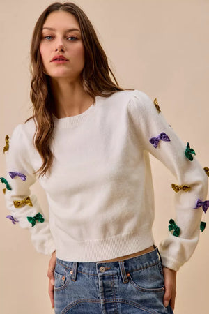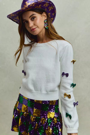 SO ME Mardi Gras Glitter Bow Ribbon Sweater Knit Top