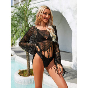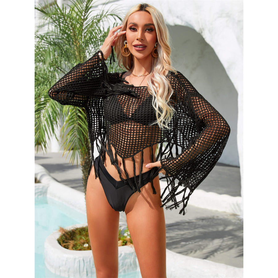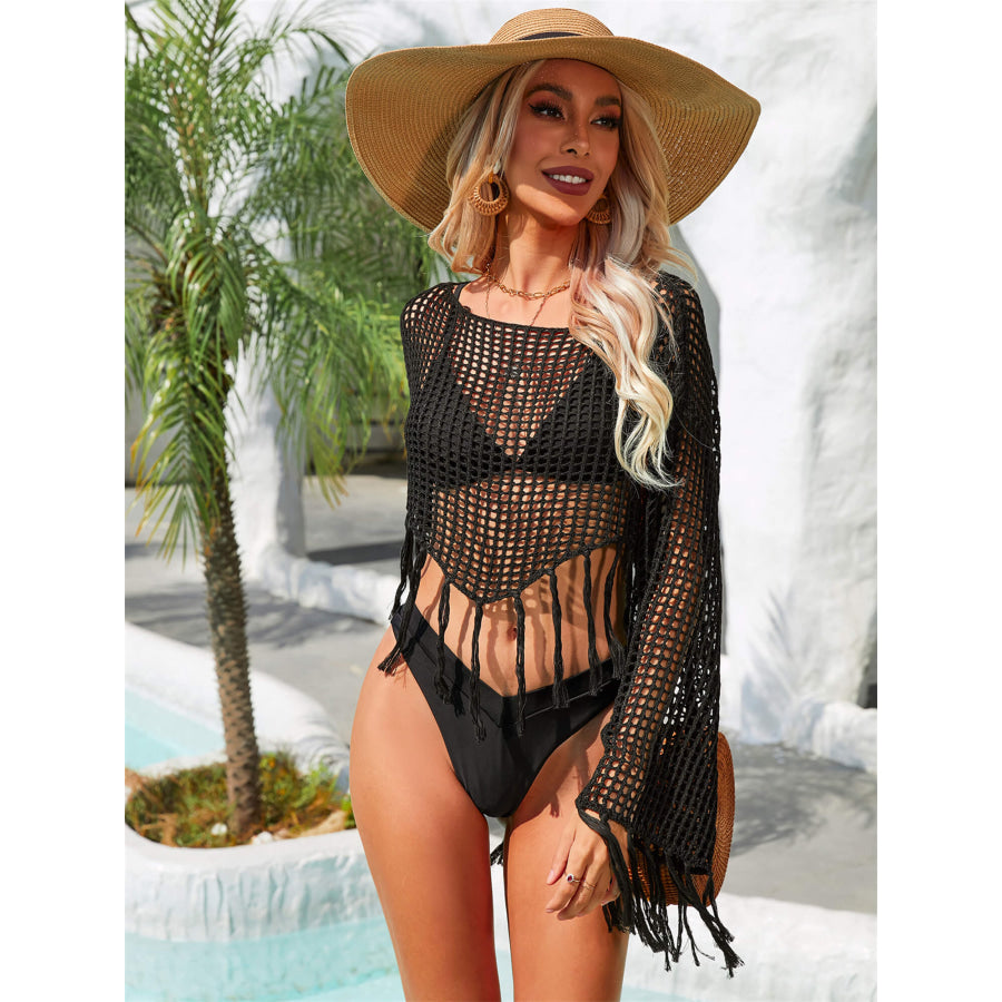 Fringe Trim Flare Sleeve Openwork Cover Up