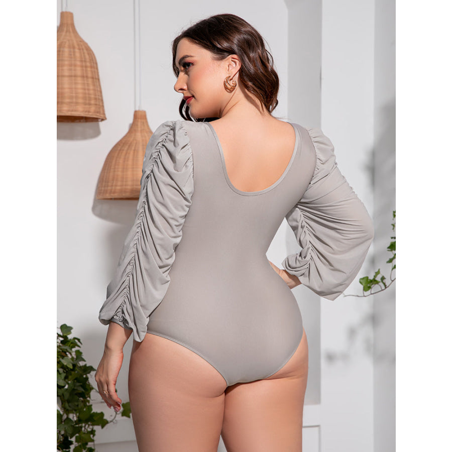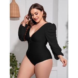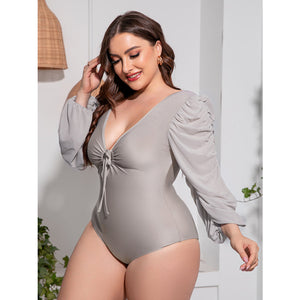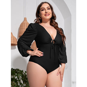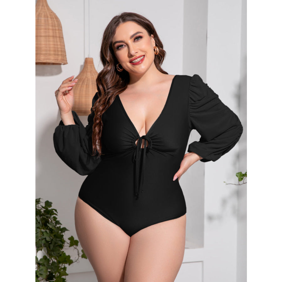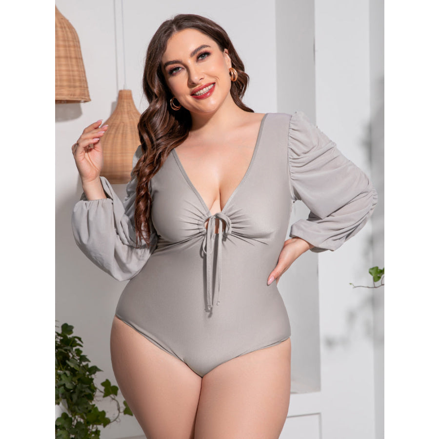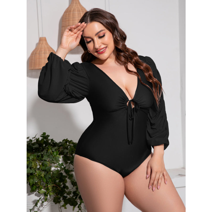 Plus Size Tied Deep V Balloon Sleeve One-Piece Swimsuit