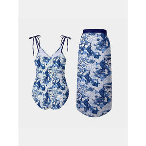 Printed Tie Shoulder Swimwear and Skirt Swim Set