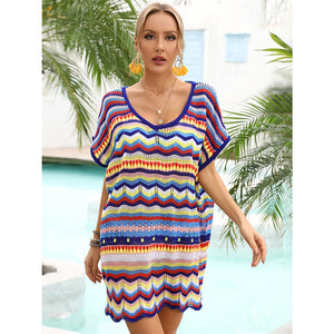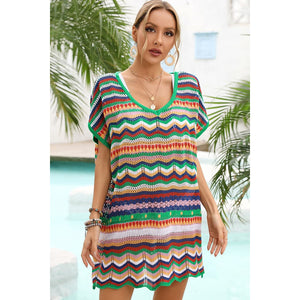 Rainbow Stripe Scalloped V-Neck Cover-Up Dress