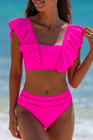 Rose Red Tie Back Ruffled 2pcs Bikini Swimsuit