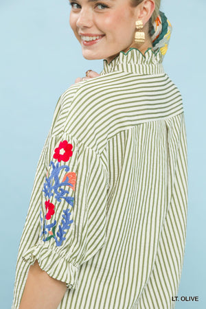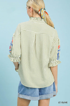 Umgee Embroidered Ruffle Trim Stripe Blouse