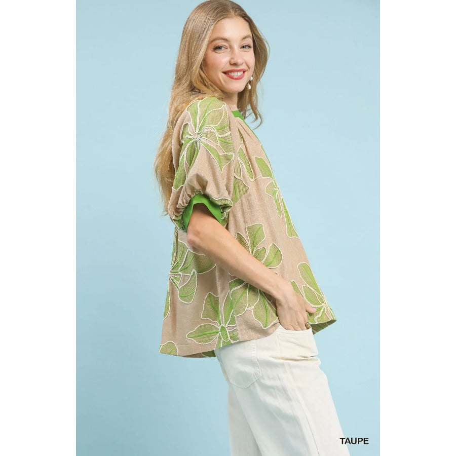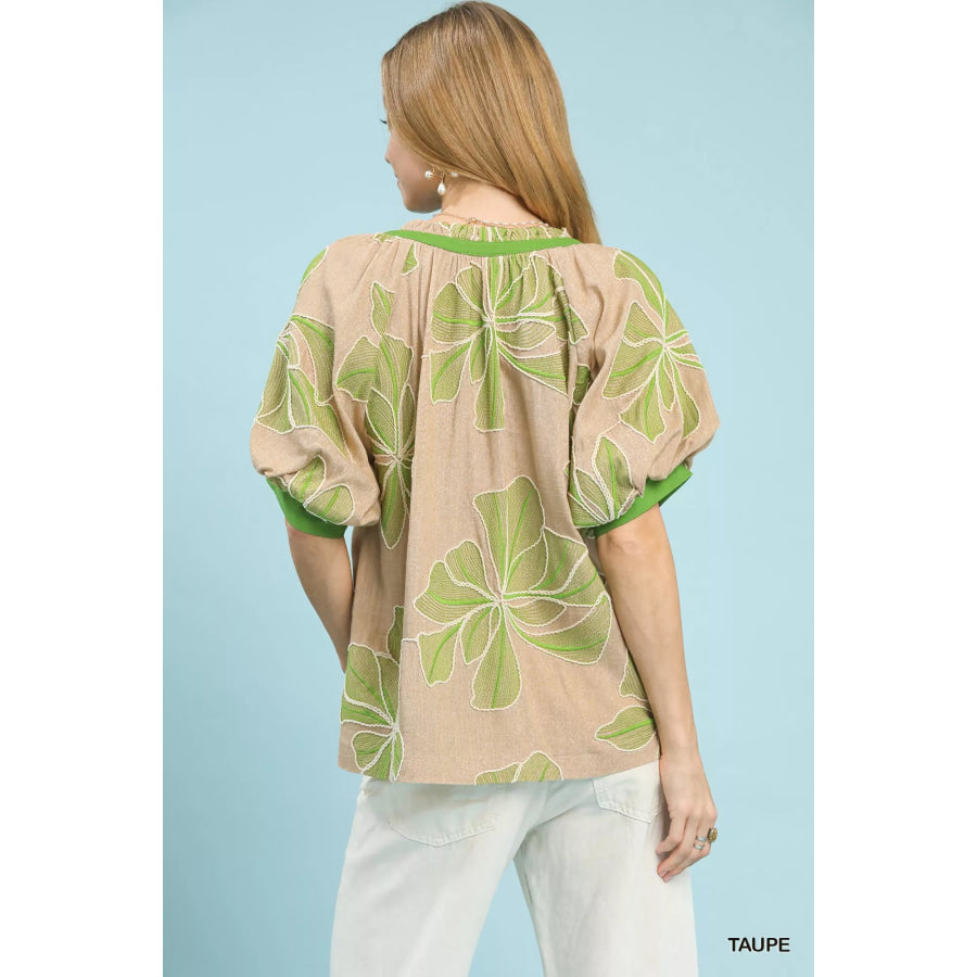 This embroidered V-neck top is made of linen, providing both comfort and style. The split V-neck with contrast trim adds a touch of elegance to the design. Elbow-length puff sleeves with contrast cuffs give it a unique and fashionable look. The straight hemline adds a clean finish to the top. Lined for added comfort and a luxurious feel.