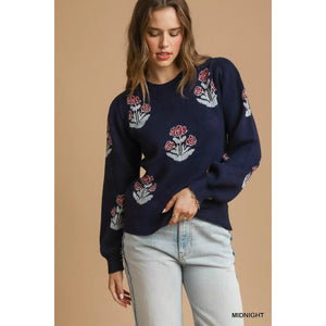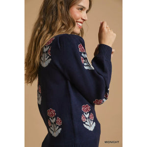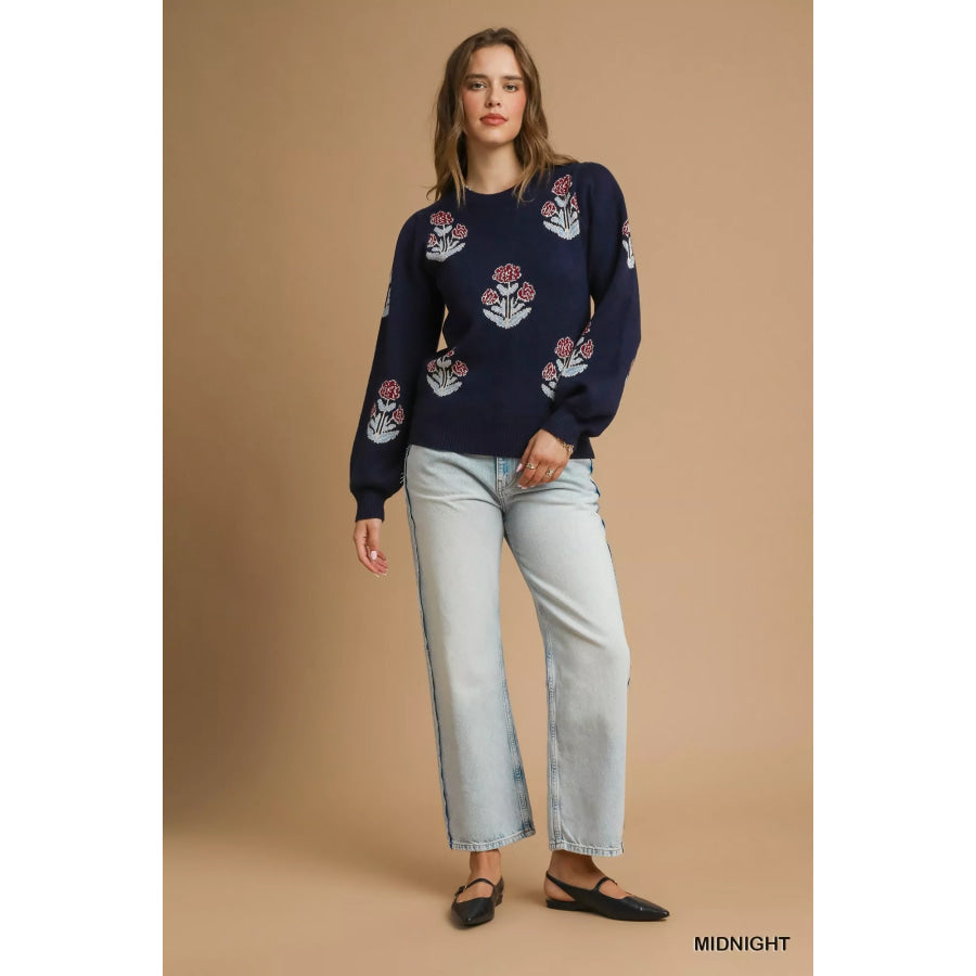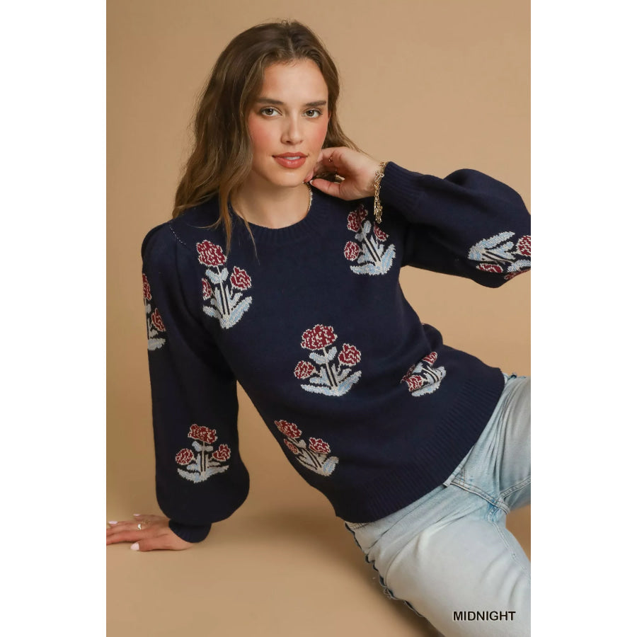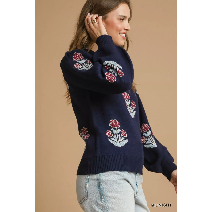 Umgee Floral Knit Sweater with Puff Sleeves