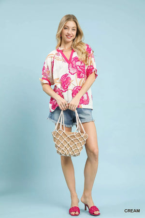 Umgee Floral V-Neck Puff Sleeve Blouse