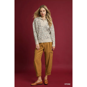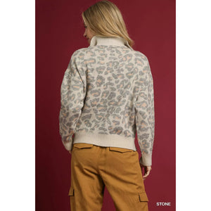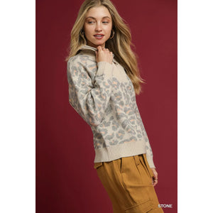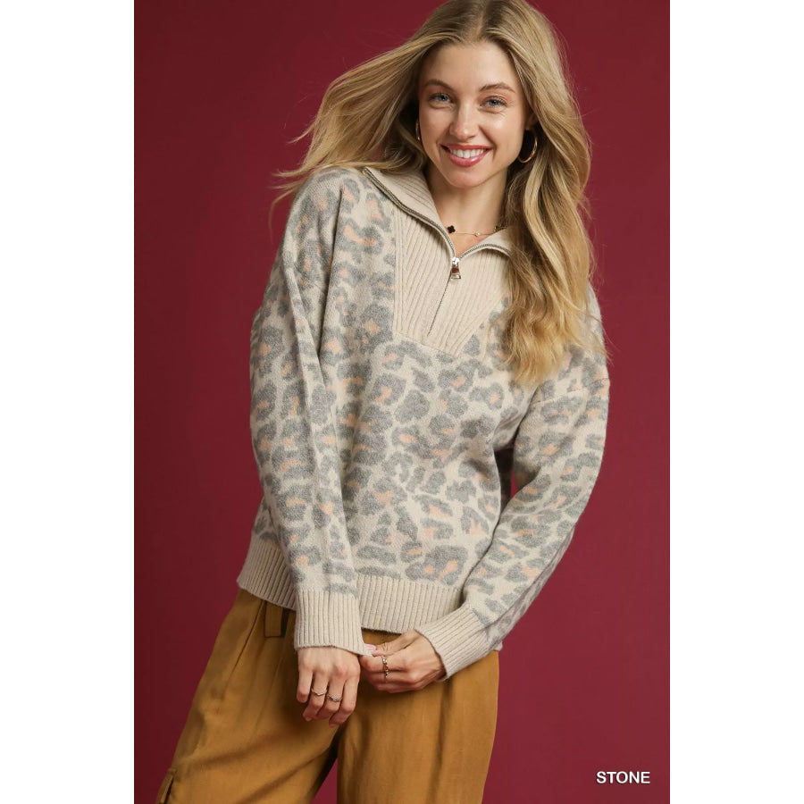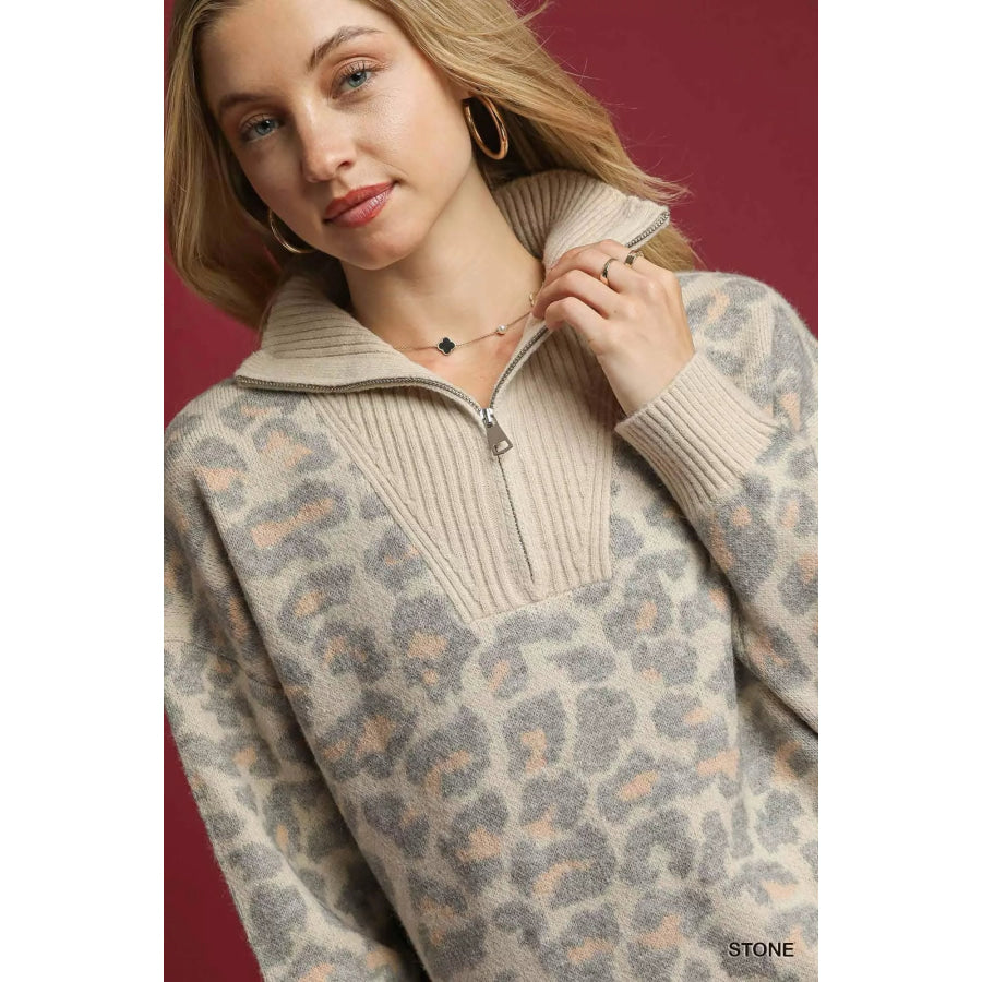 Umgee Leopard Print Quarter-Zip Knit Sweater