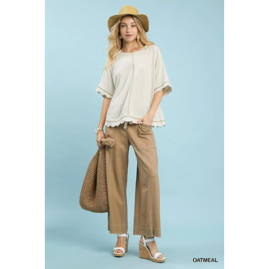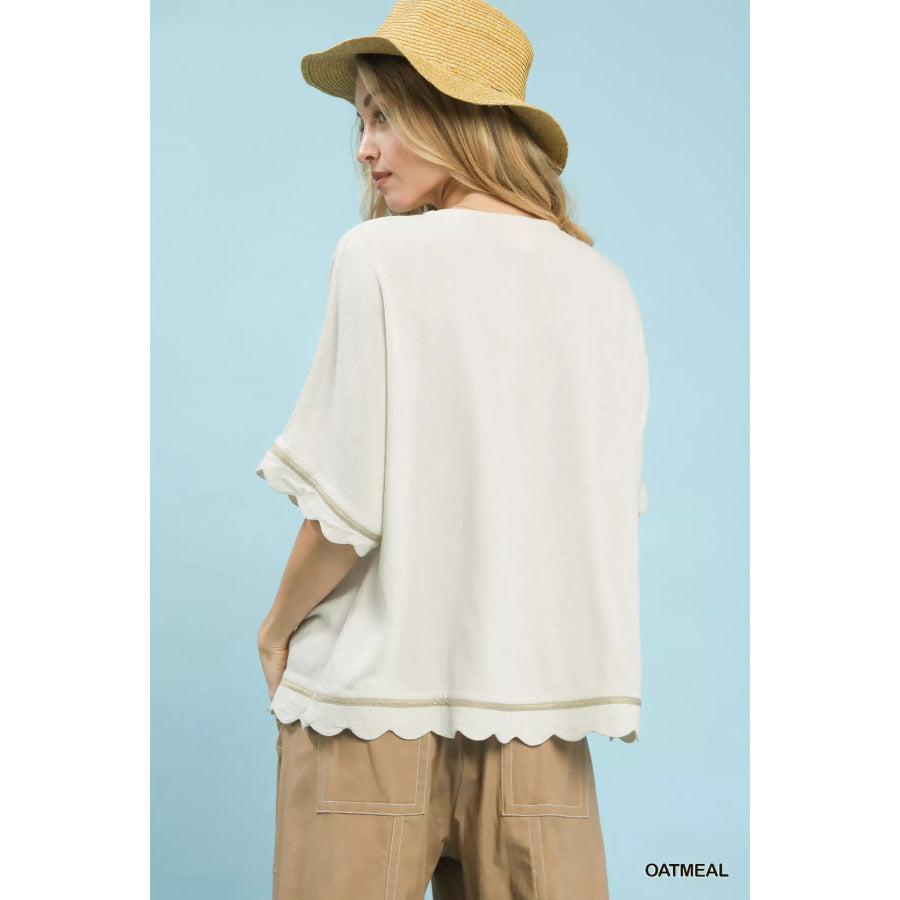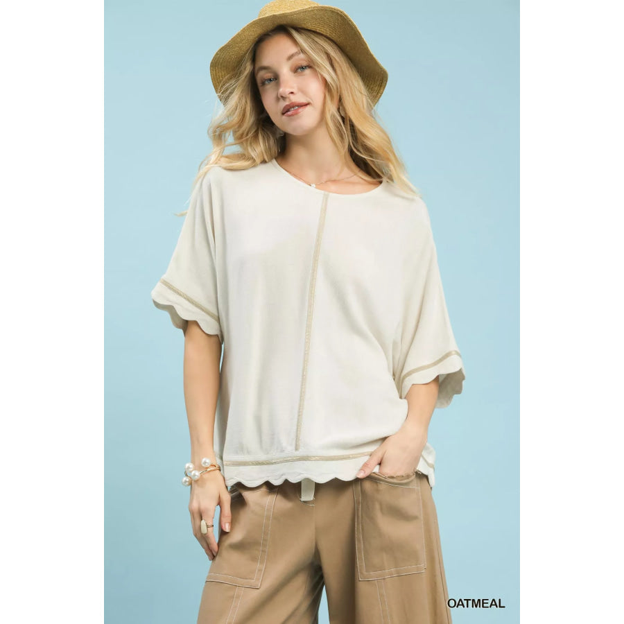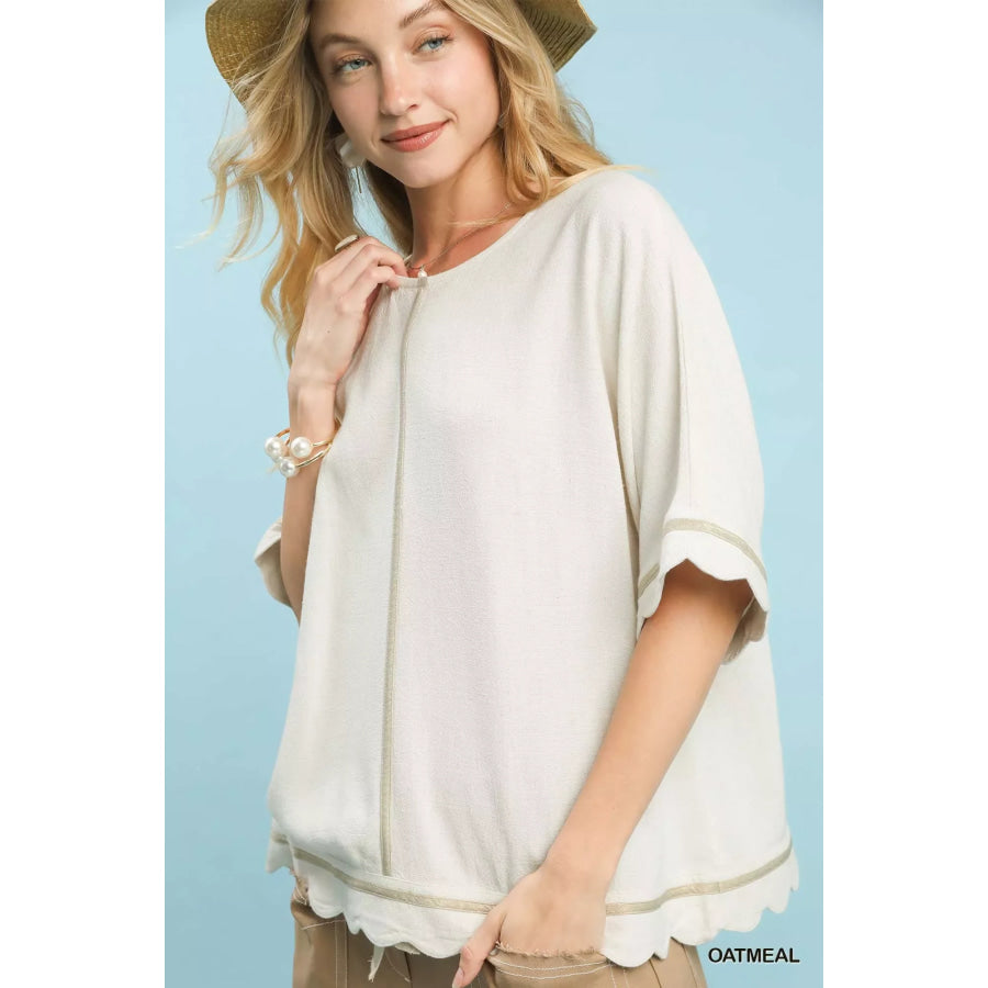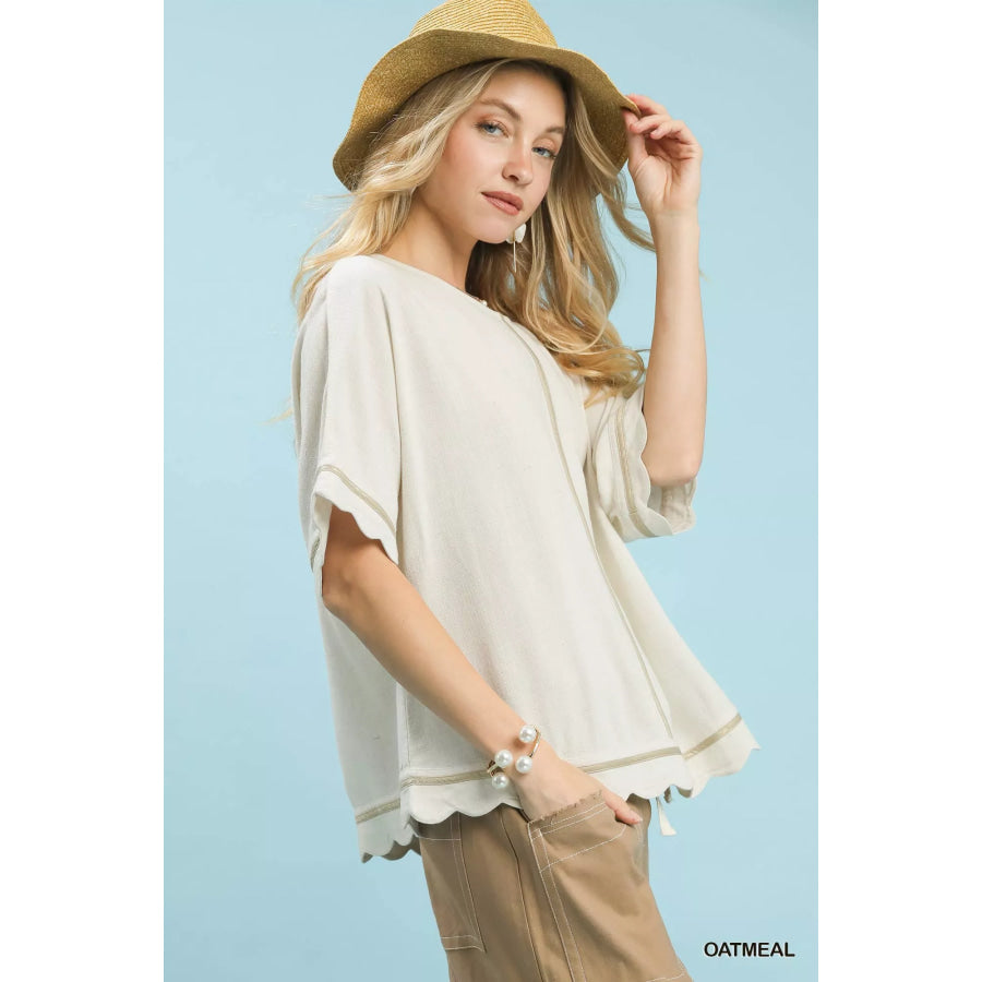This Linen Blend Scallop Trim Top features a solid design with a chic center seam detail. The round neckline and short dolman sleeves with scallop edge add a touch of elegance to this piece. The scalloped hemline further enhances its feminine appeal. Perfect for warmer weather, this top is not lined for a lightweight and breathable feel. Upgrade your wardrobe with this stylish and versatile top today!