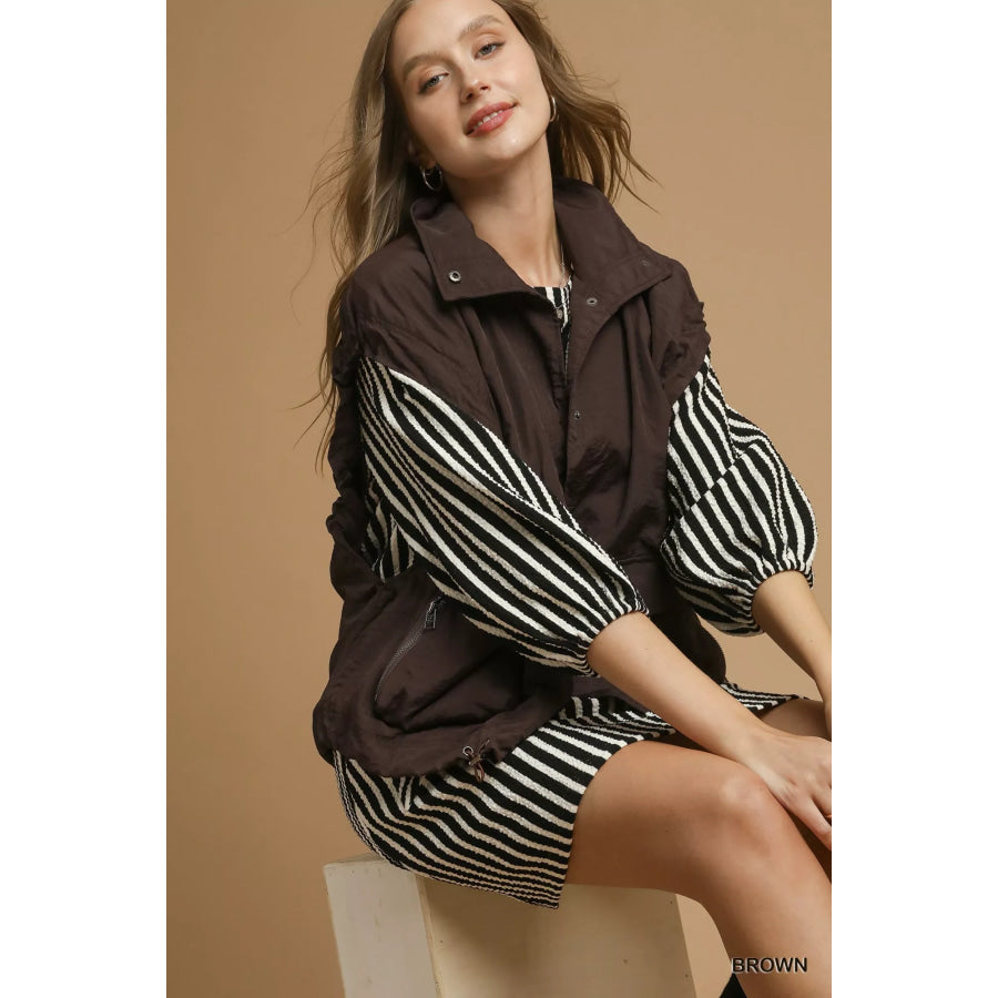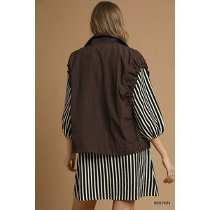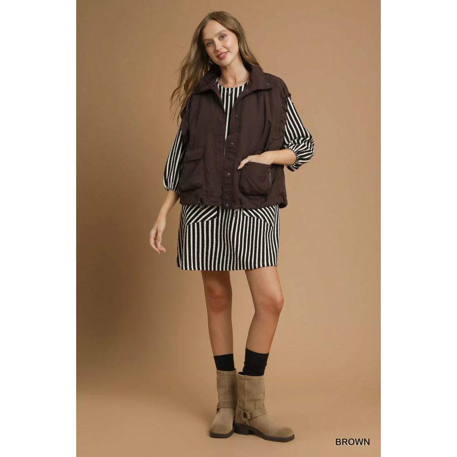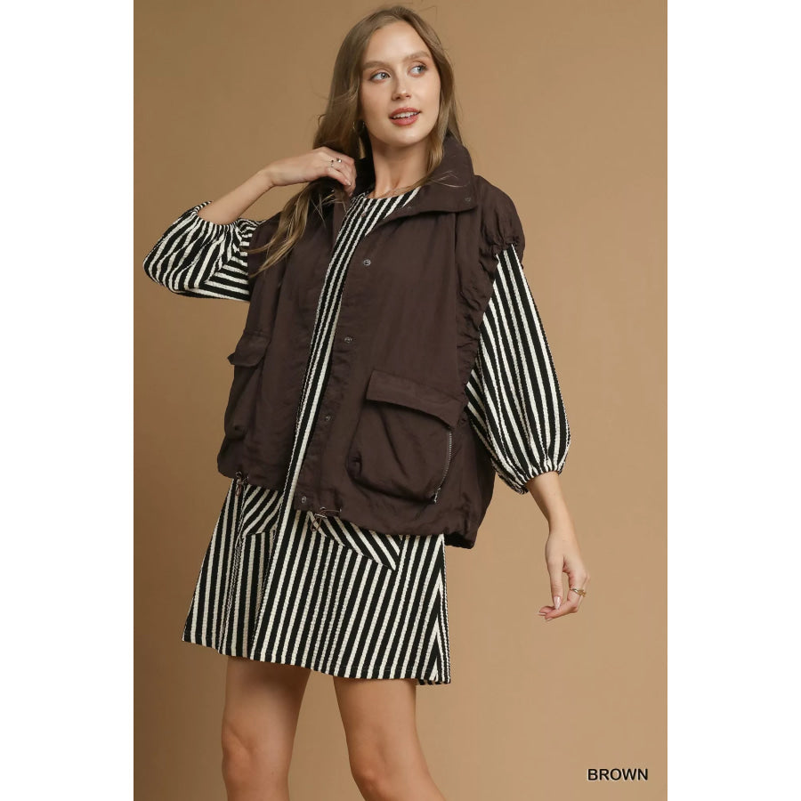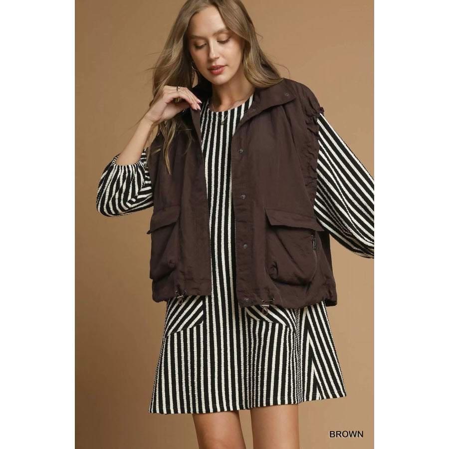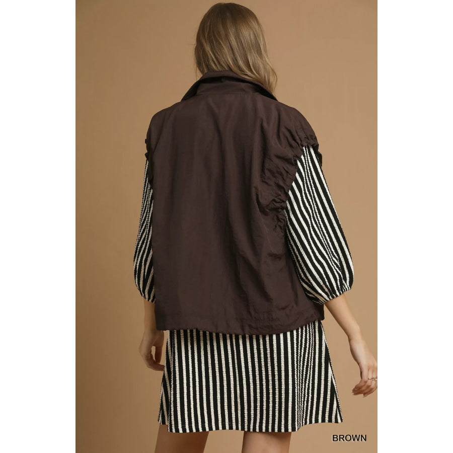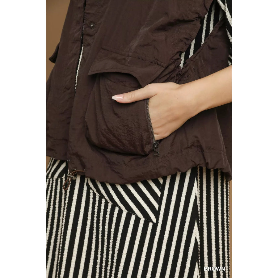This stylish brown vest coat is a versatile addition to any wardrobe. Crafted from lightweight material, it offers a comfortable and breathable fit, perfect for layering. The button-up closure and functional pockets add practicality, while the collar design enhances its casual appeal. Ideal for creating a chic and effortless look.