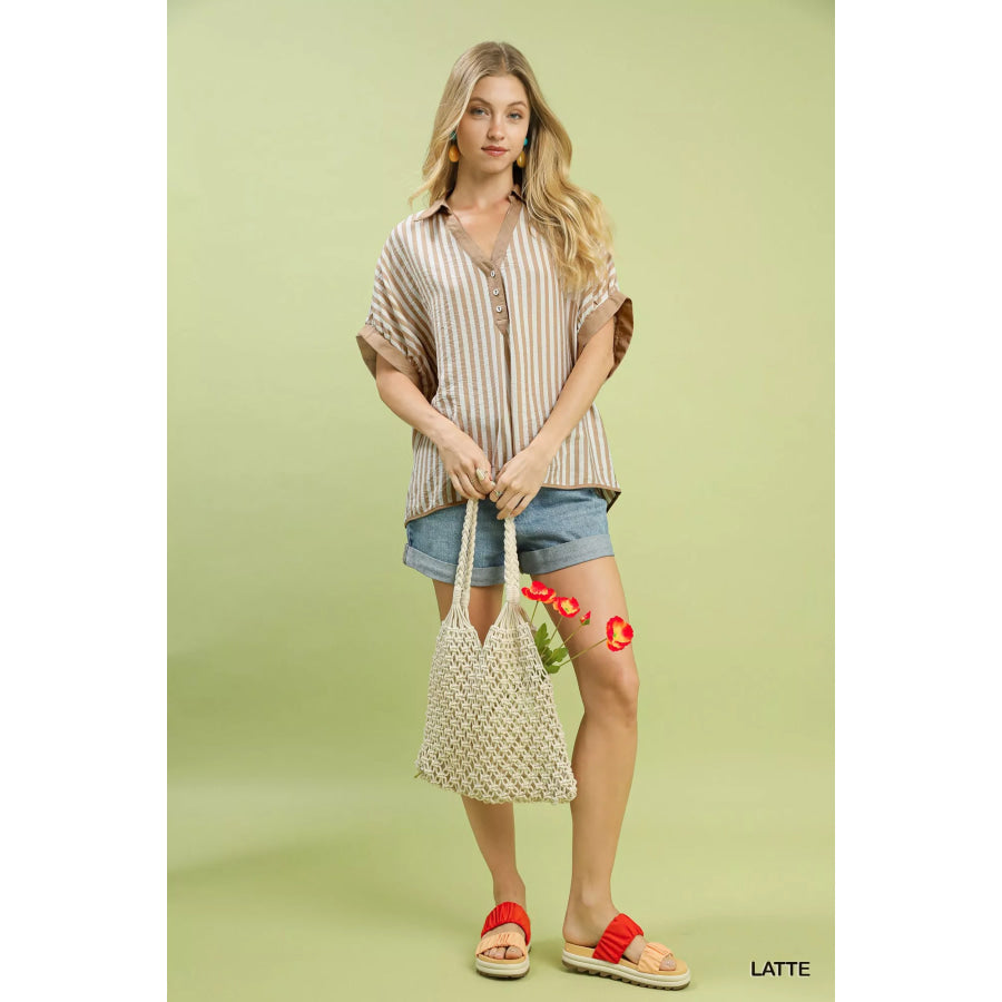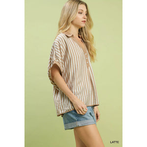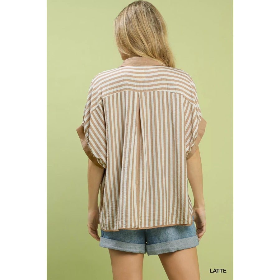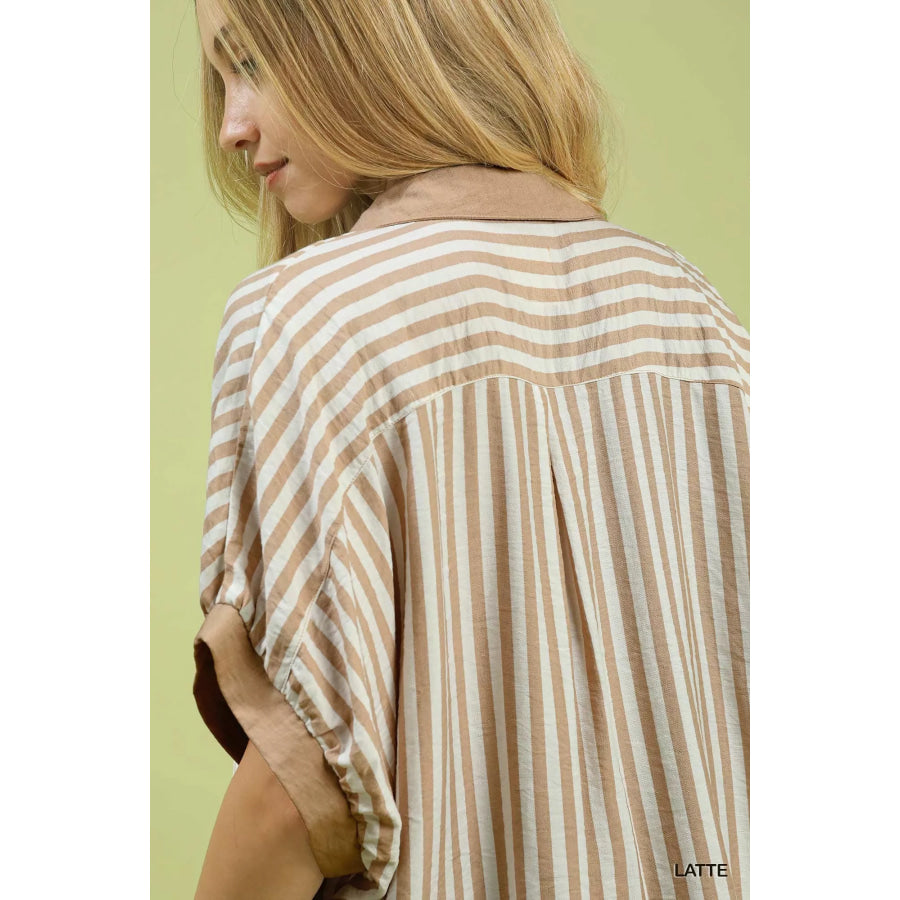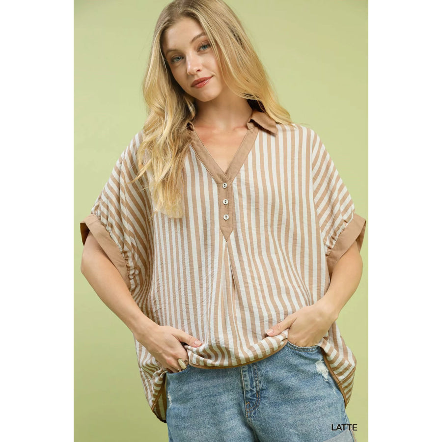 The Stripe Collared Oversized Top is a versatile and stylish addition to any wardrobe. It features a split V-neck with button-front detail for a classic yet trendy look. The short cuffed sleeves add a touch of casual charm to this top. With a straight hem and contrast trim, the design is modern and visually appealing. The oversized fit offers a relaxed and comfortable silhouette suitable for various occasions. Please note that this top is not lined, making it lightweight and breathable.