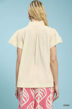 This stylish blouse features a split V-neck with a soft ruffle collar, adding a touch of femininity to the design. The flutter sleeves create a flowy and elegant look, perfect for both casual and dressy occasions. The subtle texture of the fabric adds depth and interest to the overall appearance. This blouse is versatile and can be easily paired with your favorite bottoms for a complete and chic outfit. Please note that this blouse is not lined for a lightweight and breathable feel.