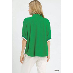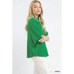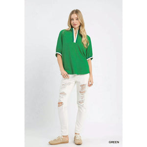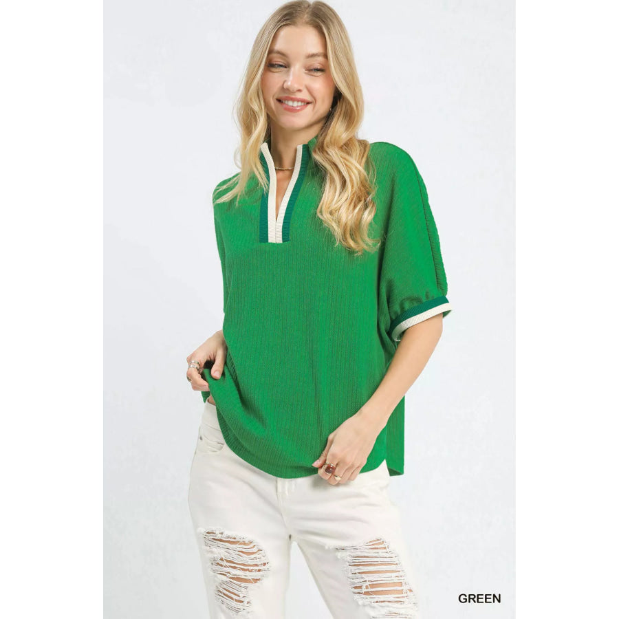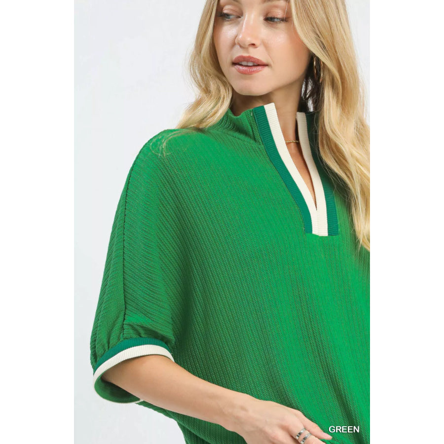 This textured knit top with contrast trim features a split neckline with a striped accent for a chic touch. The short dolman sleeves add a modern and relaxed vibe to the design. With a relaxed, boxy fit, this top offers comfort and style in one. It is not lined, making it lightweight and breathable for everyday wear. Perfect for adding a pop of style to your casual wardrobe.