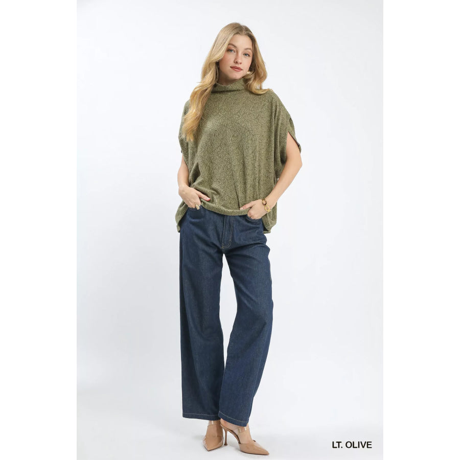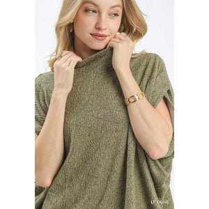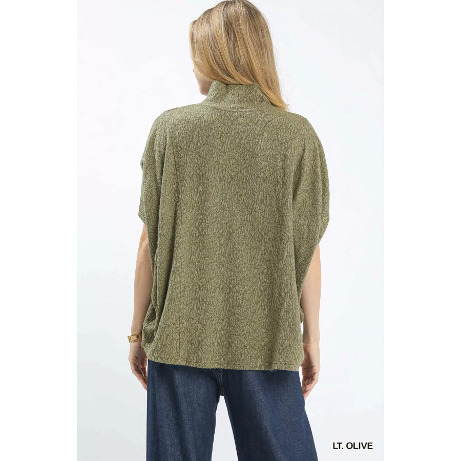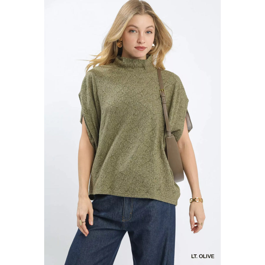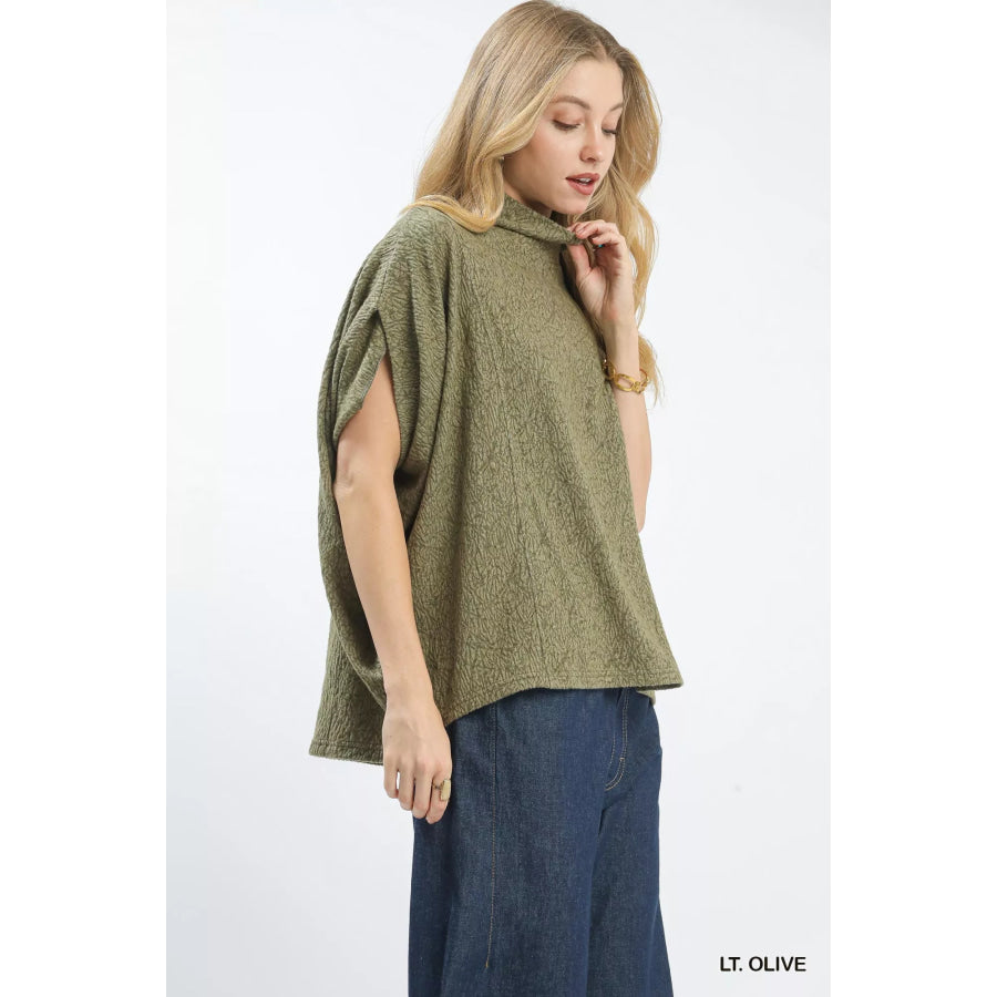 This textured mock neck relaxed top offers a cozy and stylish look with its fleece texture and mock neck design. The short dolman sleeves with side slits add a modern touch to the relaxed silhouette. The straight, easy-fit hemline provides a comfortable and effortless fit for everyday wear. Ideal for layering or wearing on its own, this top is versatile and easy to style. Please note that it is not lined, making it great for layering during cooler months.