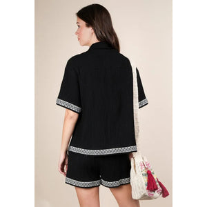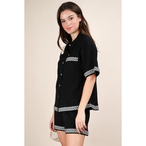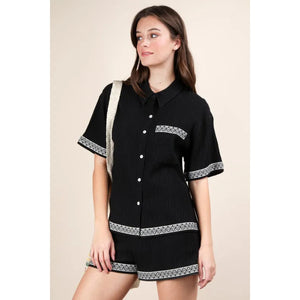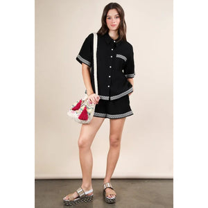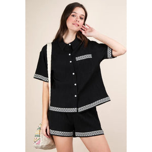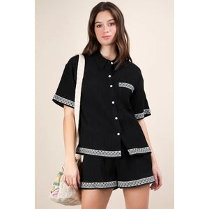 The crinkled woven shirt top and shorts set is a versatile and stylish outfit choice for casual days or summer events. The crinkled texture adds a unique touch to the woven fabric, giving it a relaxed and laid-back vibe. This matching set offers an effortless and coordinated look, perfect for staying cool and comfortable in warm weather.