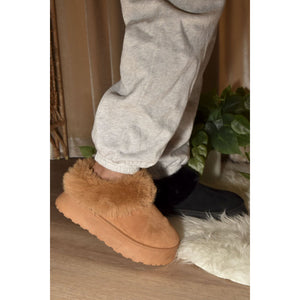 Faux-fur platform slip-on booties are a stylish and cozy footwear option for the colder months. These booties typically feature a faux-fur lining or trim for added warmth and comfort, and a platform sole for extra height and style. The slip-on design makes them easy to put on and take off, while still providing a secure fit. These booties can be paired with jeans, leggings, or even dresses to add a trendy and cozy element to your outfit. The platform sole adds a fashion-forward touch, while the faux-fur detail adds a luxurious feel. These booties are versatile and can be dressed up or down for various occasions.