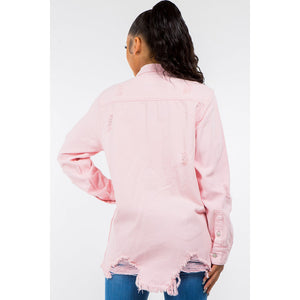 The Frayed Hem Distressed Denim Jacket is a stylish and trendy outerwear piece. Its frayed hem adds a unique and edgy touch to the classic denim jacket design. The distressed details give it a worn-in and vintage look. This jacket is perfect for adding a touch of coolness to any outfit. It's versatile and can be styled with jeans, skirts, or dresses for a fashionable and casual look. A must-have for those who love to embrace the rugged and distressed fashion trend.