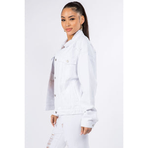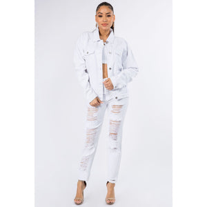 The Graphic Distressed Long Sleeve Denim Jacket is a stylish and edgy outerwear piece that adds a touch of personality to any outfit. Featuring eye-catching graphic details and distressed accents, this jacket exudes a cool and rugged vibe. The long sleeves provide extra coverage and warmth, making it perfect for layering over your favorite tops. Pair it with jeans for a double denim look, or mix it with a dress for a playful juxtaposition of styles. Stay fashion-forward and effortlessly cool with this statement denim jacket.
