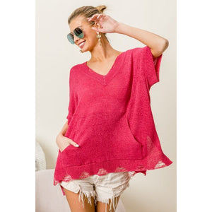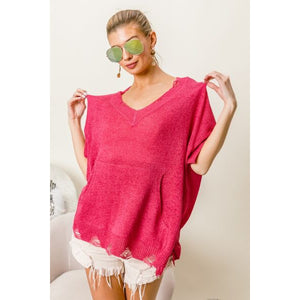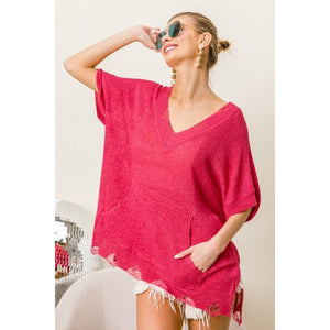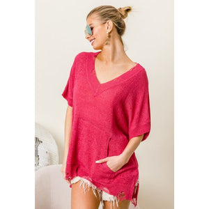 The Distressed Hem V-Neck Slit Sweater is a fashionable and versatile piece that exudes a modern edge. With its V-neck design and distressed hem detailing, this sweater offers a trendy and unique look. The side slits add a touch of sophistication and provide a comfortable fit. Made from quality material, this sweater is both stylish and cozy. Whether you dress it up with tailored pants or keep it casual with jeans, this sweater is a perfect choice for a chic and effortless outfit. Elevate your style with the Distressed Hem V-Neck Slit Sweater, a stylish addition to any wardrobe.