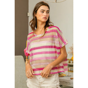 BiBi Striped Openwork Short Sleeve Knit Cover Up