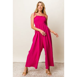 The Texture Smocked Sleeveless Jumpsuit is a chic and versatile piece for your wardrobe. Its smocked bodice adds texture and creates a flattering silhouette. The sleeveless design is perfect for warm weather and can easily be layered with a jacket for cooler evenings. Made with high-quality fabric, this jumpsuit is comfortable and durable. Whether you're headed to a brunch or a night out, the Texture Smocked Sleeveless Jumpsuit will make a stylish statement. Pair it with sandals for a casual look or dress it up with heels for a more dressed-up occasion. You'll love the effortless style and comfort this jumpsuit brings to your outfit.
