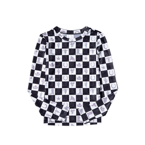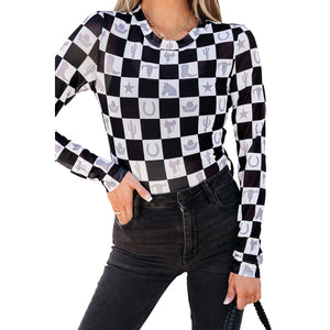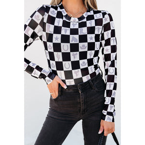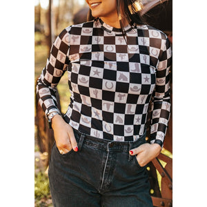Black Checkerboard Western Elements Printed Mesh Long Sleeve Top