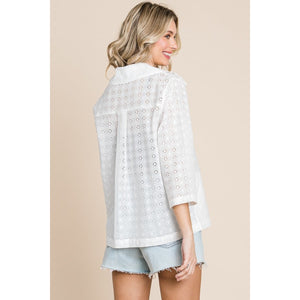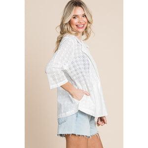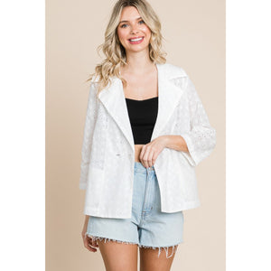 This Double Breasted Eyelet Jacket with Pockets is a chic and versatile piece for your wardrobe. The double-breasted silhouette and eyelet detailing add a touch of sophistication to your outerwear collection. Equipped with convenient pockets, this jacket is both stylish and functional. Whether you're dressing for work or a night out, this jacket is a fashionable choice. The classic design and tailored fit make it a timeless addition to any outfit. Elevate your look with this statement jacket that combines style and practicality effortlessly.