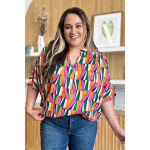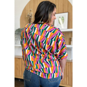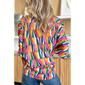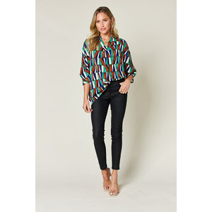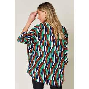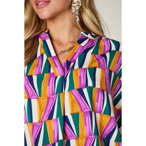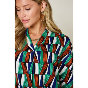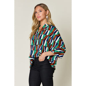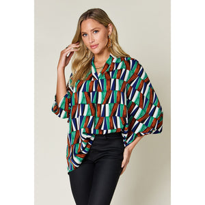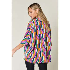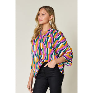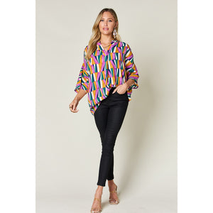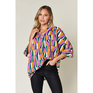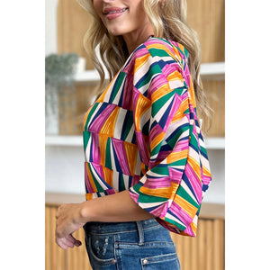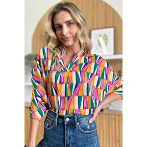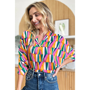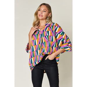 Double Take Full Size Geometric Notched Raglan Sleeve Blouse